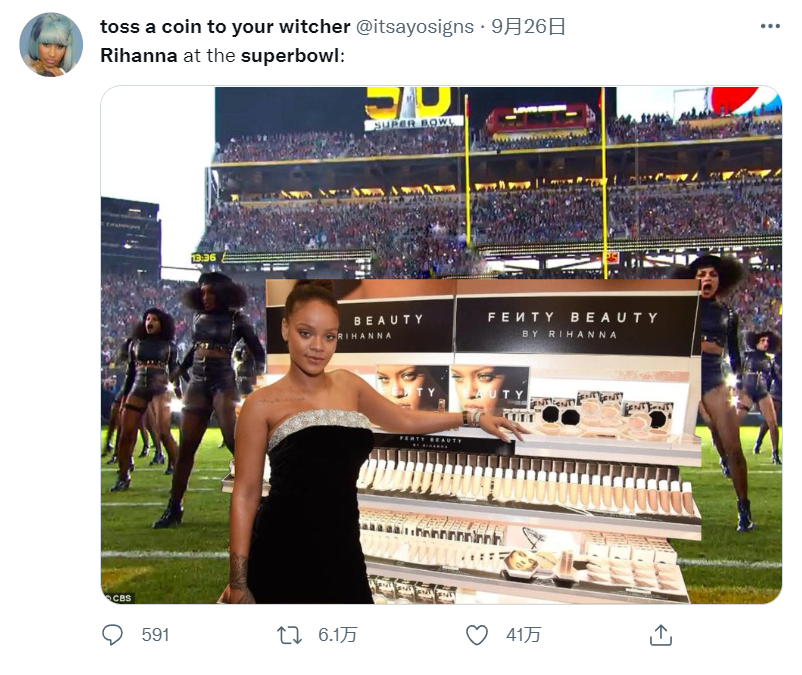 品牌在狂欢,网友们也按耐不住造梗的热情。毕竟Rihanna这6年间在「美妆女企业家」的头衔上投注了太多精力,以至于大家这样脑补出了他们想象中的「Rihanna在超级碗」