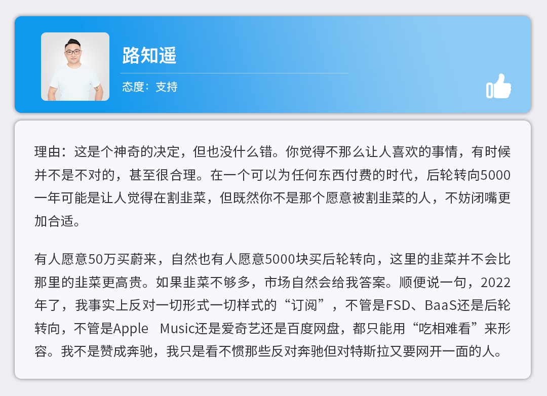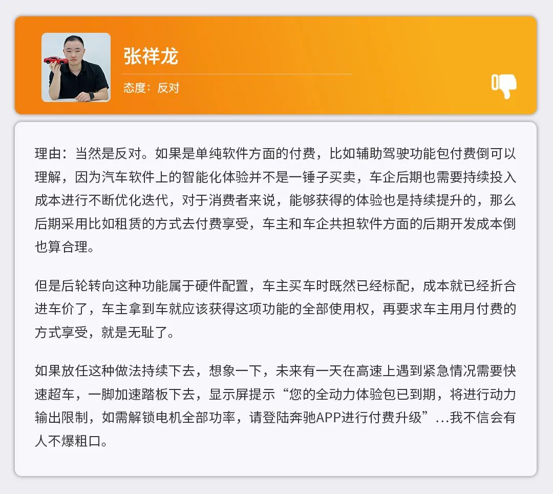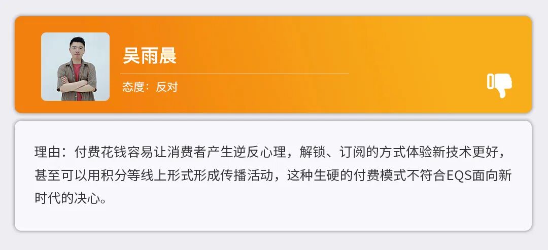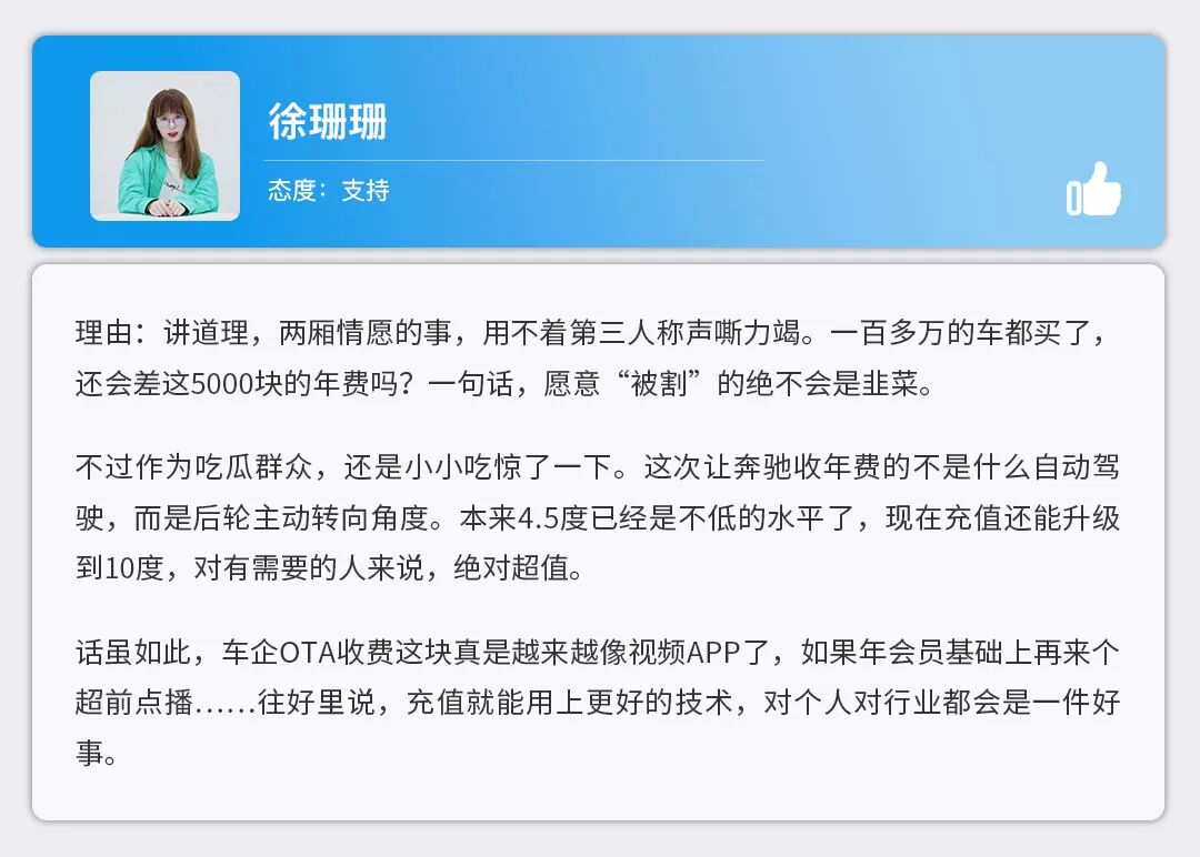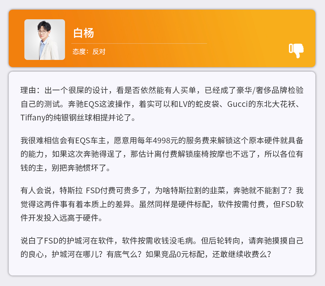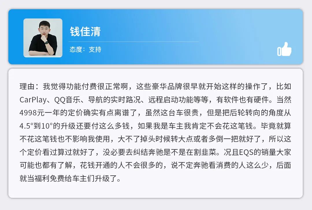 当然,也有人表示特斯拉的FSD功能也是需要花钱解锁的,为什么特斯拉就能割韭菜,奔驰怎么就不行了?对此,我们内部其实也分了2派。