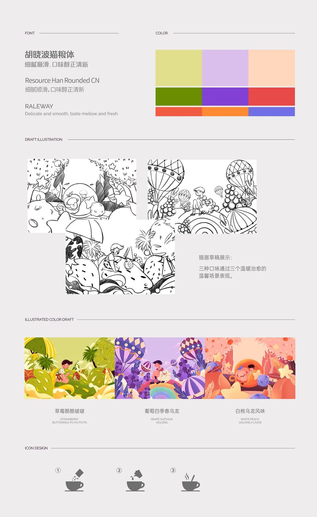 而在视觉设计上,LOGO标识对部分笔画进行特殊处理,偏圆润的笔触增强品牌独特性,符合品牌属性。针对三种口味,用三个温暖治愈的温馨场景插画表现,增强人们对产品的味觉联想。