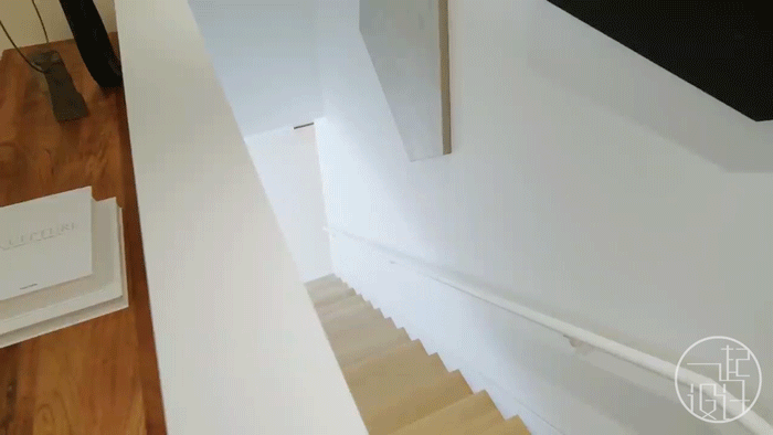 通往二层卧室空间的全木质踏板楼梯与白色扶手▽