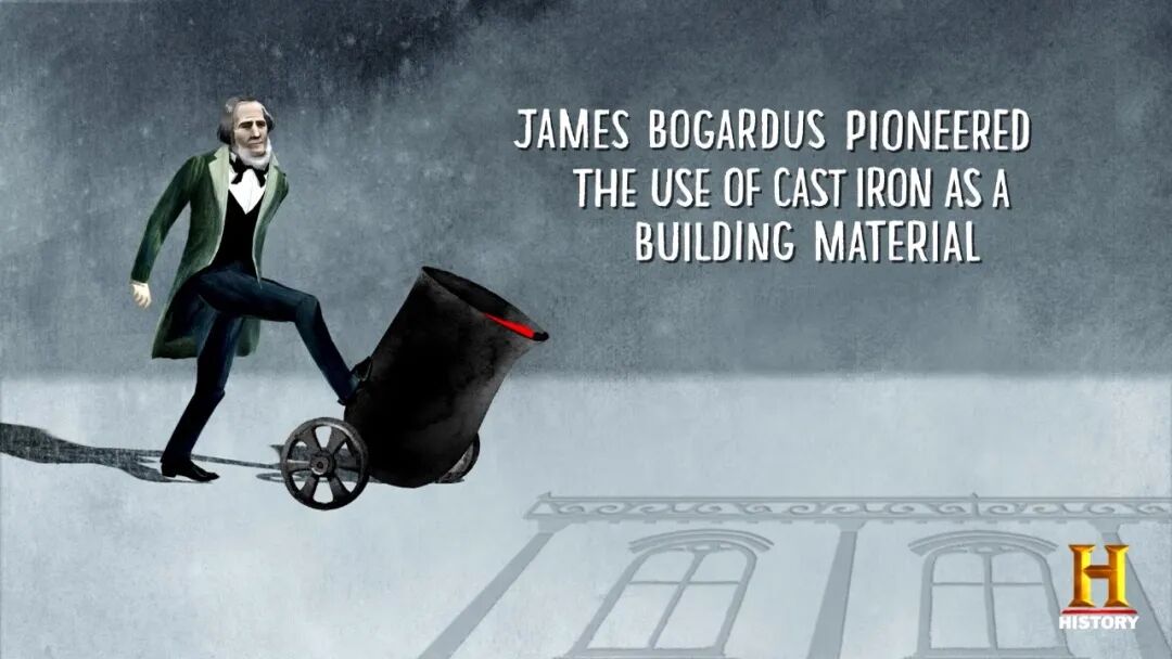 铸铁建筑的最初设计师 James Bogardus 曾描述建筑最显著特点是水平梁组成的框架结构,浇铸成渠道形状的柱顶,由减薄的希腊多利克半柱支撑。外部隔间的间距是由窗户开口的大小决定的,而不是由内部框架。因此,在某种意义上铸铁立面从一开始就可以与背后建筑分离。
