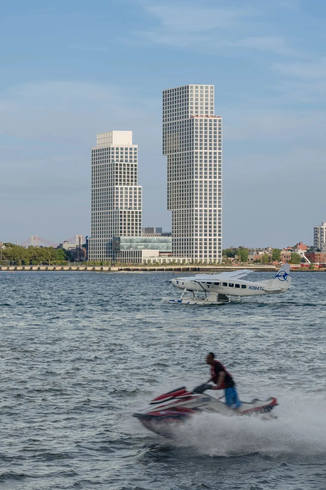42,000平方英尺的设施分布在建筑群的中心,形成一个循环。两层的室外露台模仿了塔楼的变化形式,有角度地切入庭院,并向海滨开放。在它们的上方,一座可以俯瞰曼哈顿天际线的廊桥将两座塔楼连接起来。