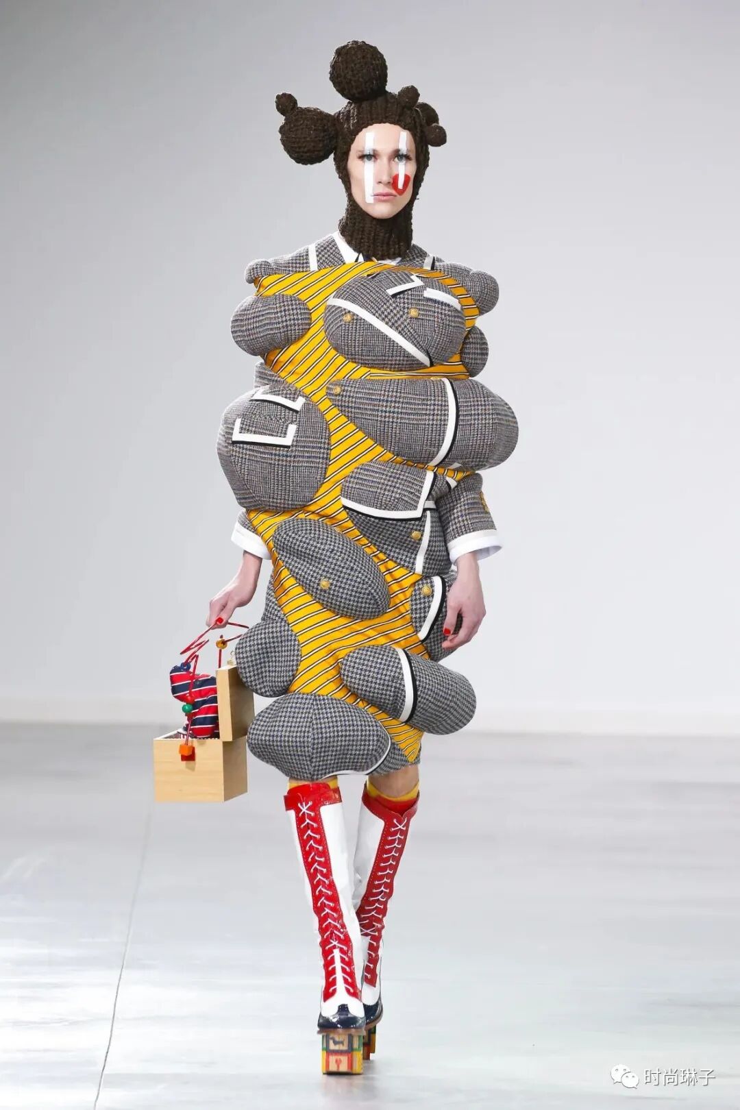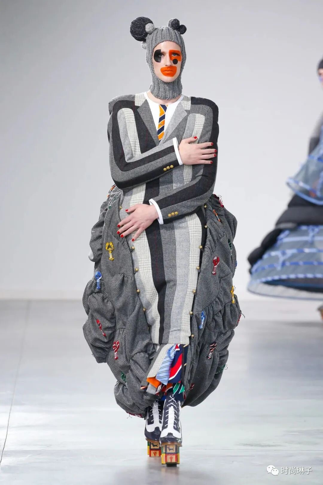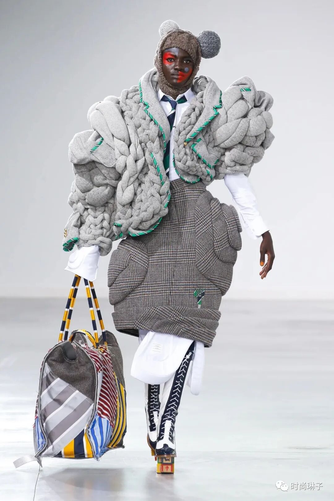 另一部分则是“概念”化的版本,夸张的龙虾造型,球形的学院风针织上衣,膨胀的外套比例……可能会令人不自觉的笑了起来。
