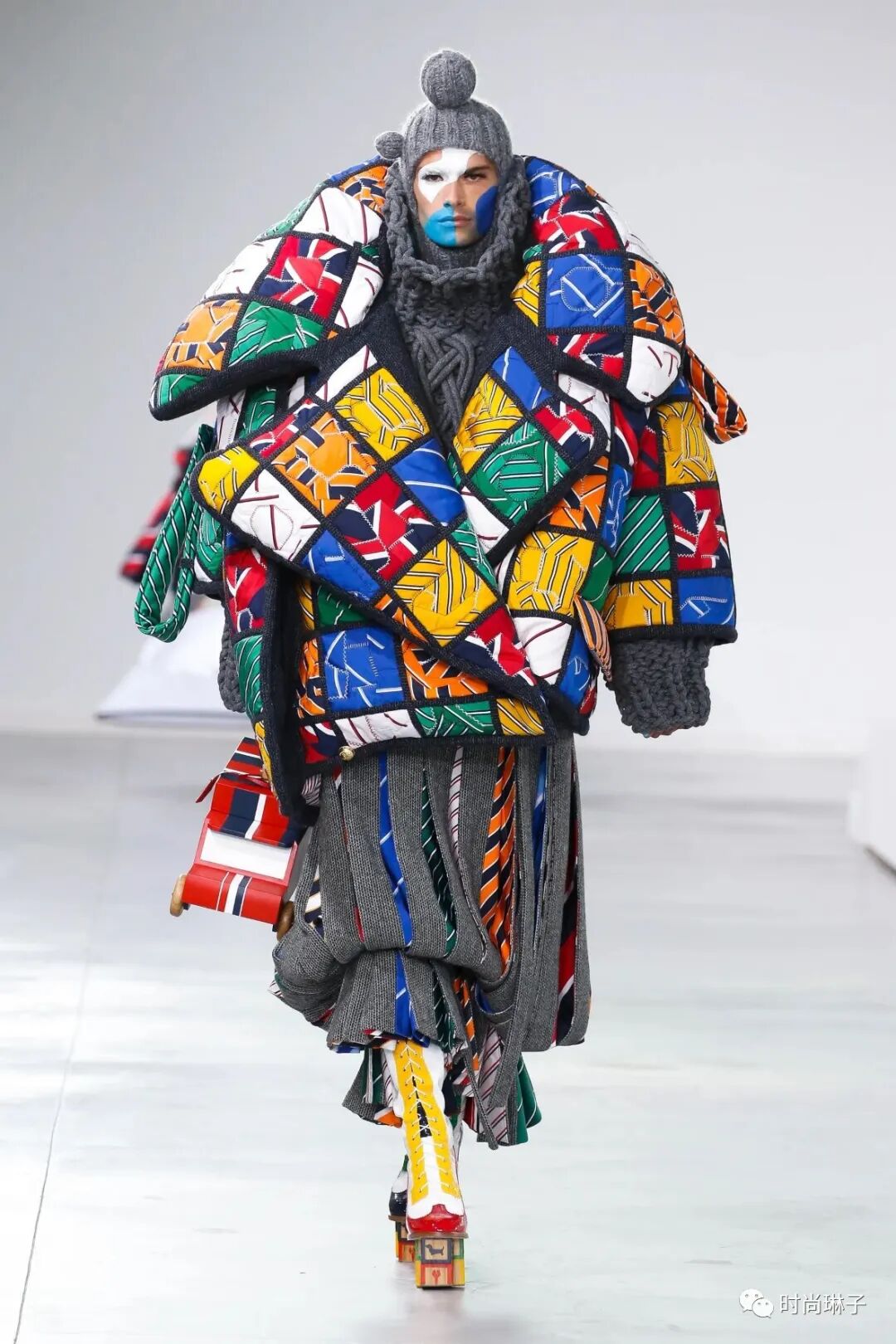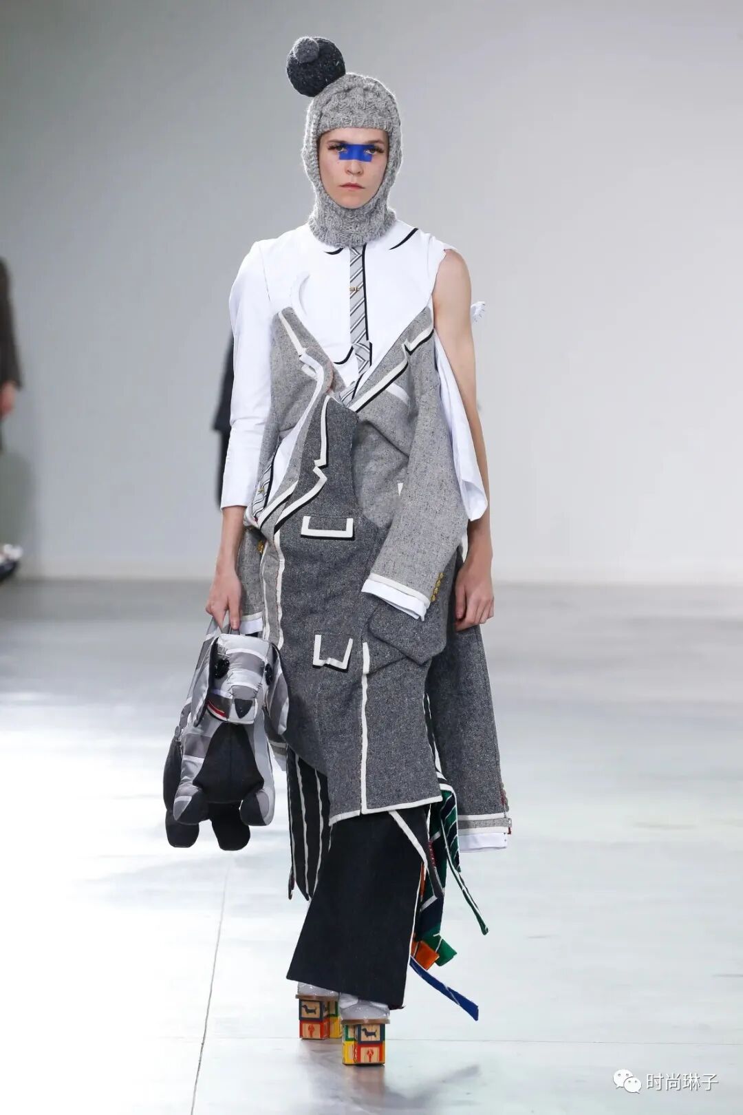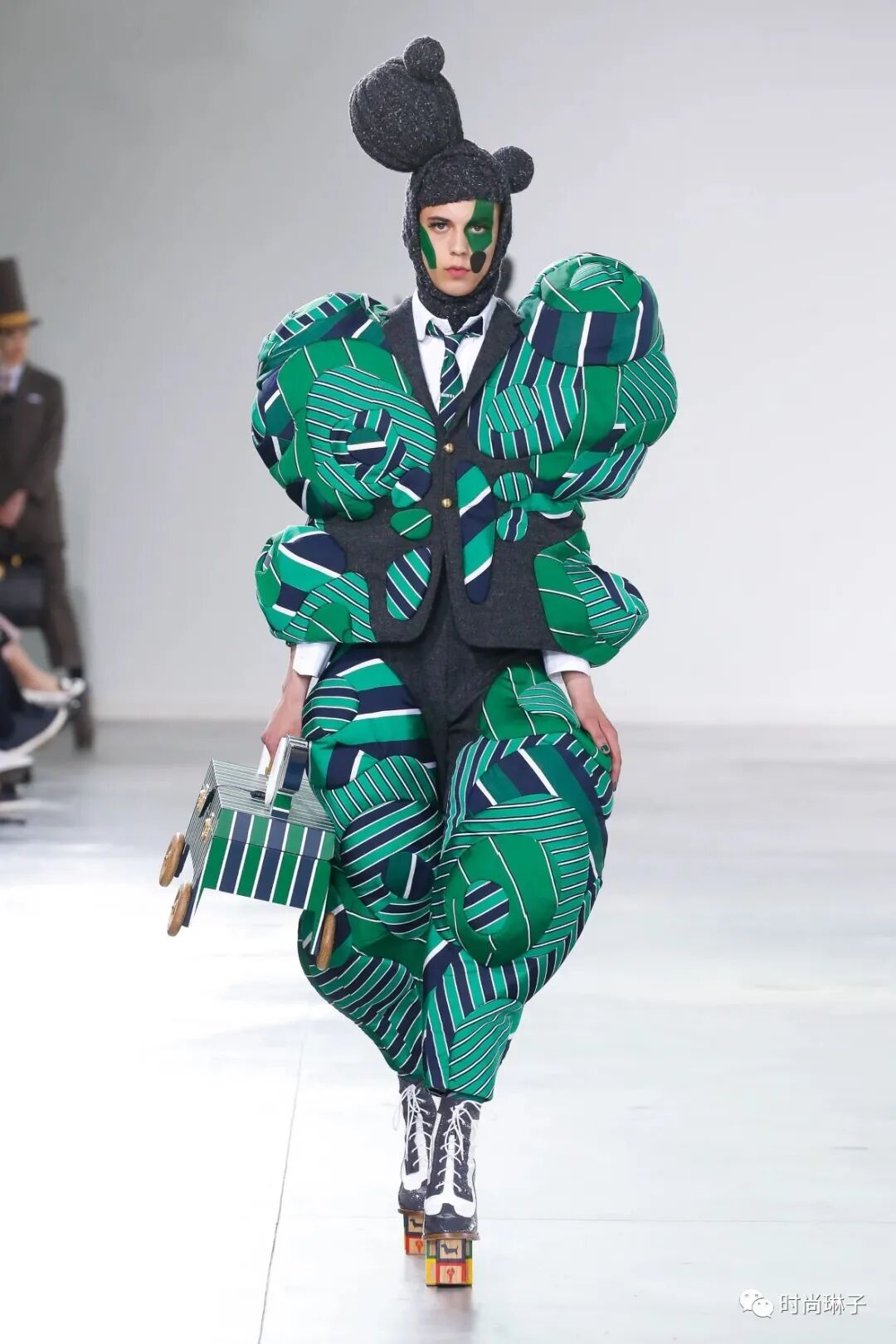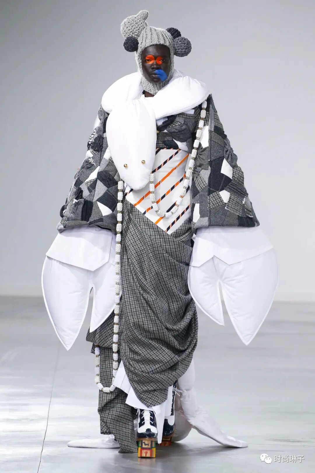 另一部分则是“概念”化的版本,夸张的龙虾造型,球形的学院风针织上衣,膨胀的外套比例……可能会令人不自觉的笑了起来。