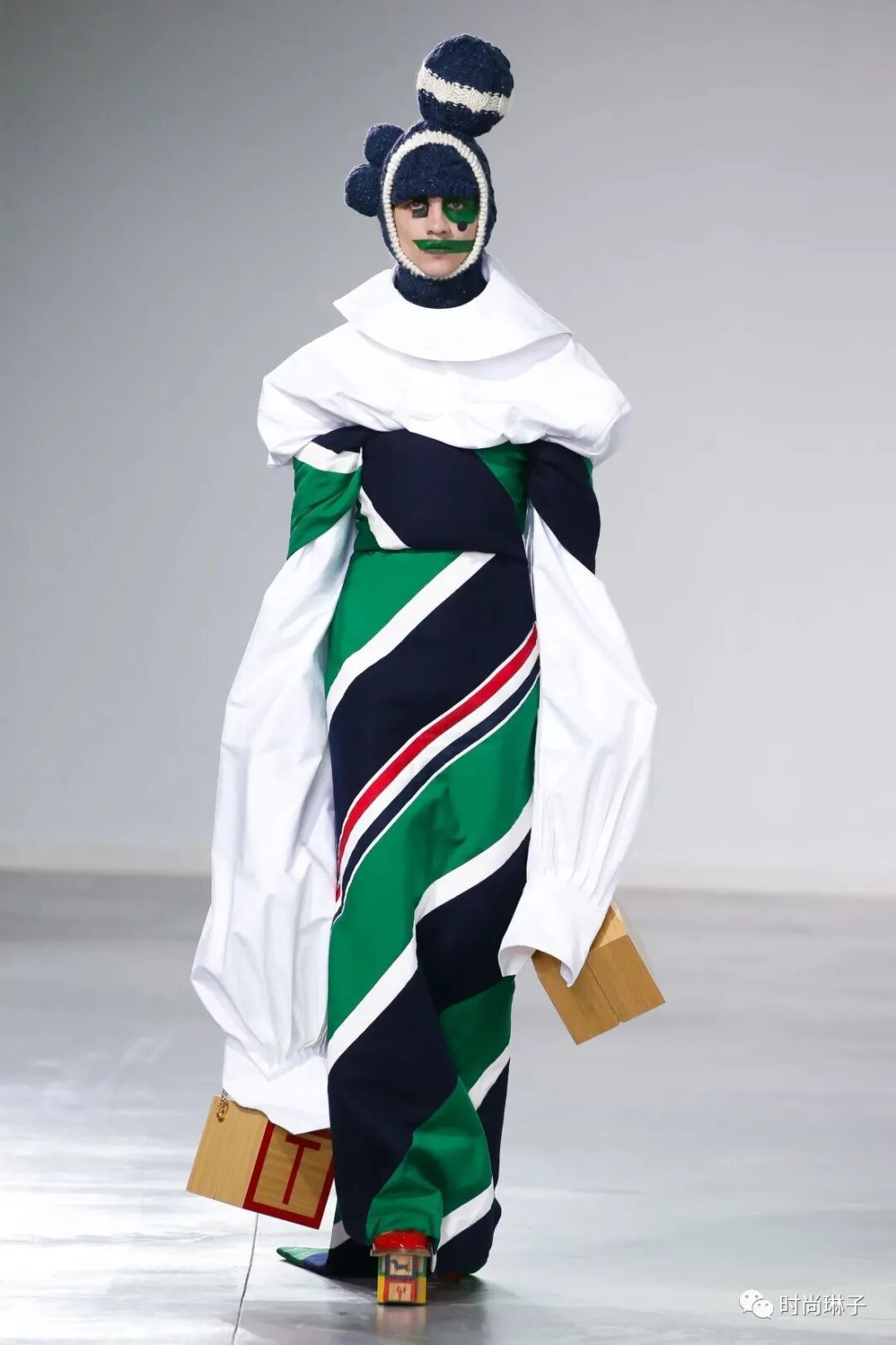 一部分是品牌标志性剪裁的“现实”版本,学院风的格纹外套搭配百褶裙或裤装,极富童趣的头部造型和积木厚底鞋,既顽皮又严肃。
