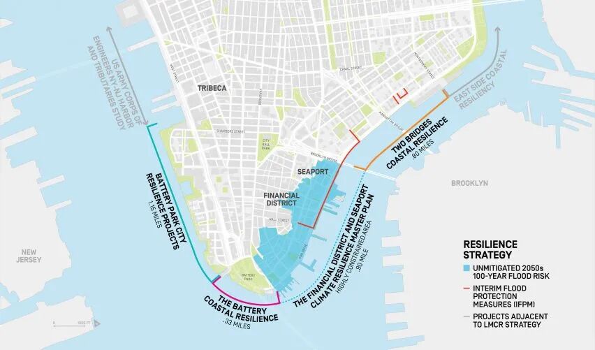2019年,时任市长白思豪公布了一项价值数十亿美元的提案,内容是重新设计曼哈顿下城“脆弱”的海岸线。数十亿美元的沿海恢复力提案将把曼哈顿下城的海岸线延伸到东河,金融区和海港气候适应总体规划的新海岸线可以在风暴期间充当防洪屏障,并保护社区免受预计的海平面上升的影响。