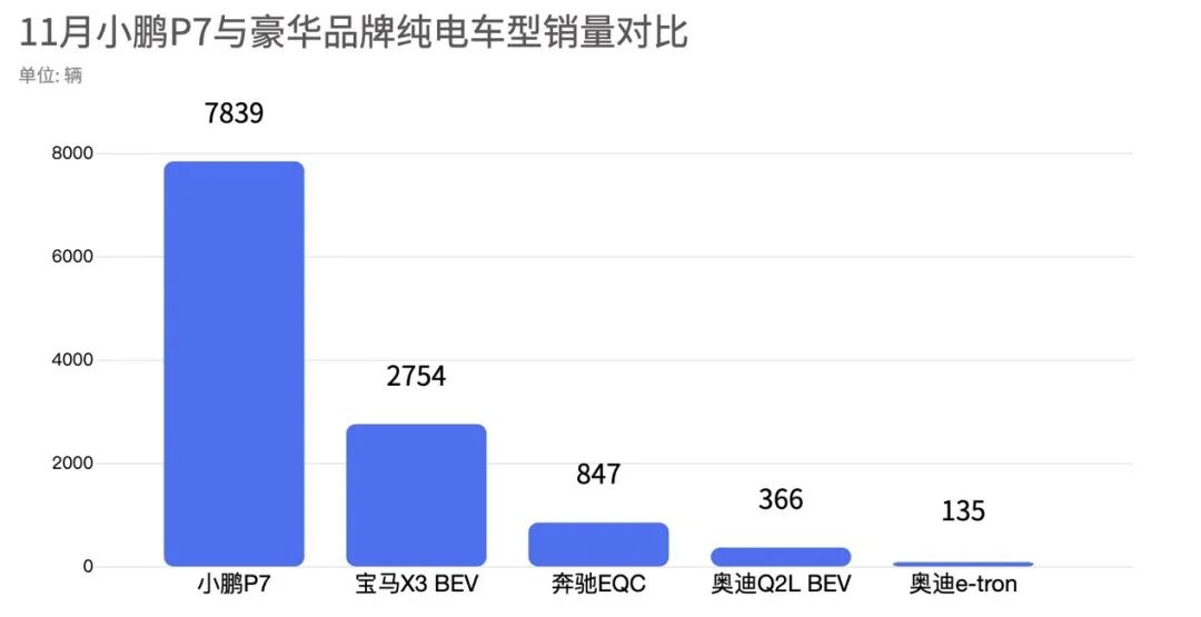 据乘联会公布的11月汽车销量数据统计显示,BBA豪华品牌在售纯电动车型累计销量为4102台,而小鹏P7单一车型的销量为7839台,后者几乎为前者的一倍,足见造车新势力旗舰产品对于传统豪华品牌的冲击力之大。