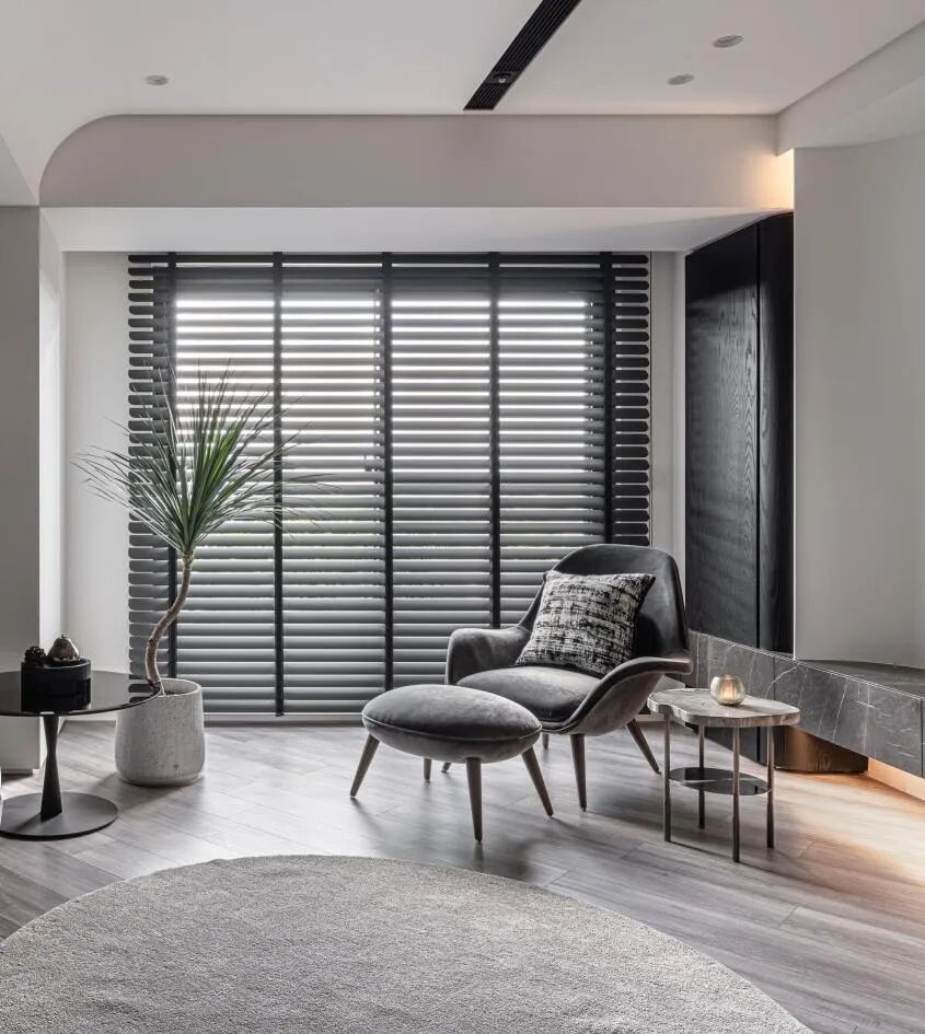 利用自然弧线,打开空间场域。石材、黑木皮与墙面和天花的白,形成对比。巨大的视觉反差,让空间更具视觉冲击,更具有吸引力。