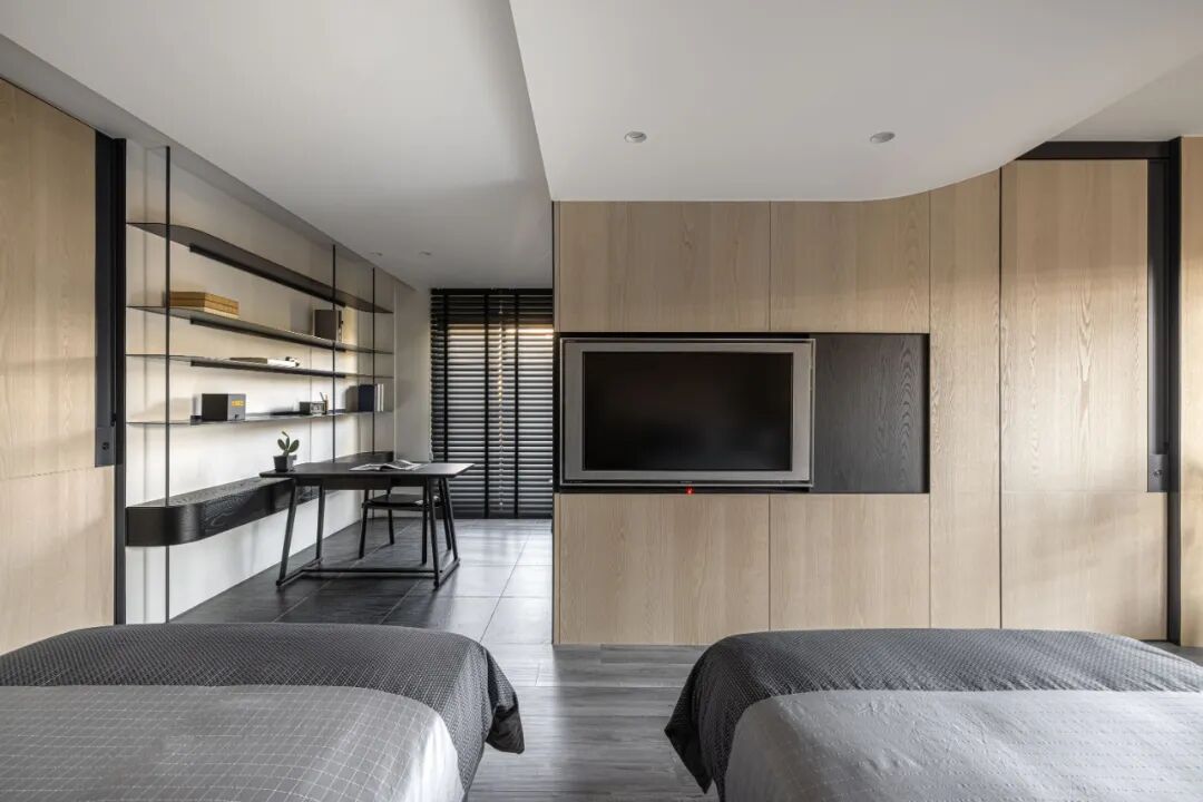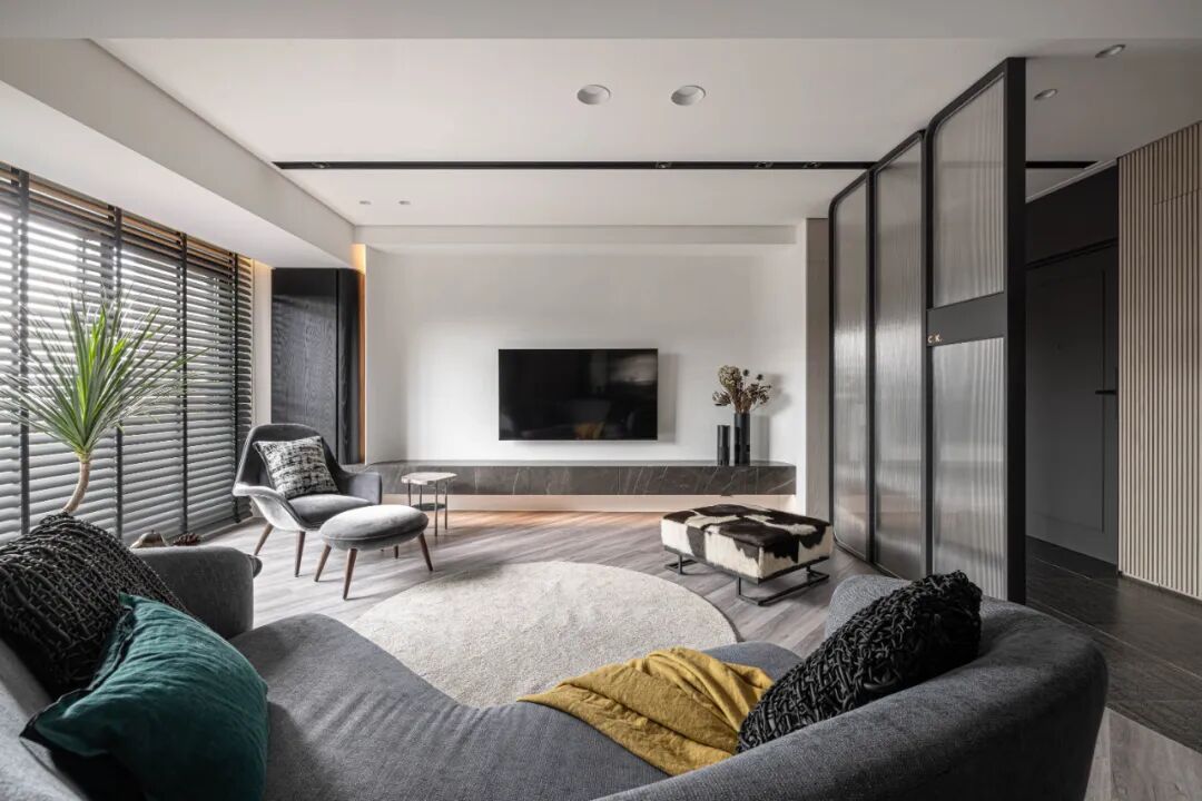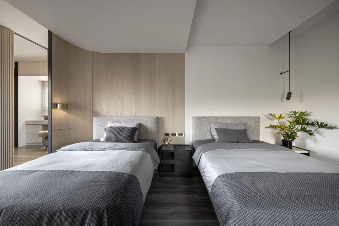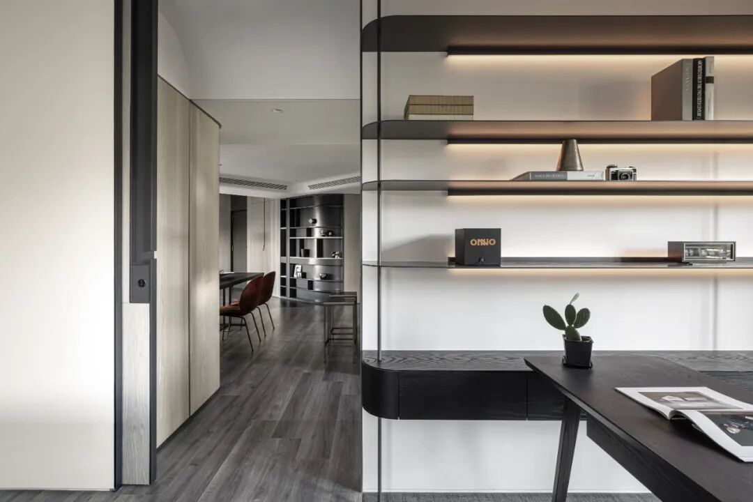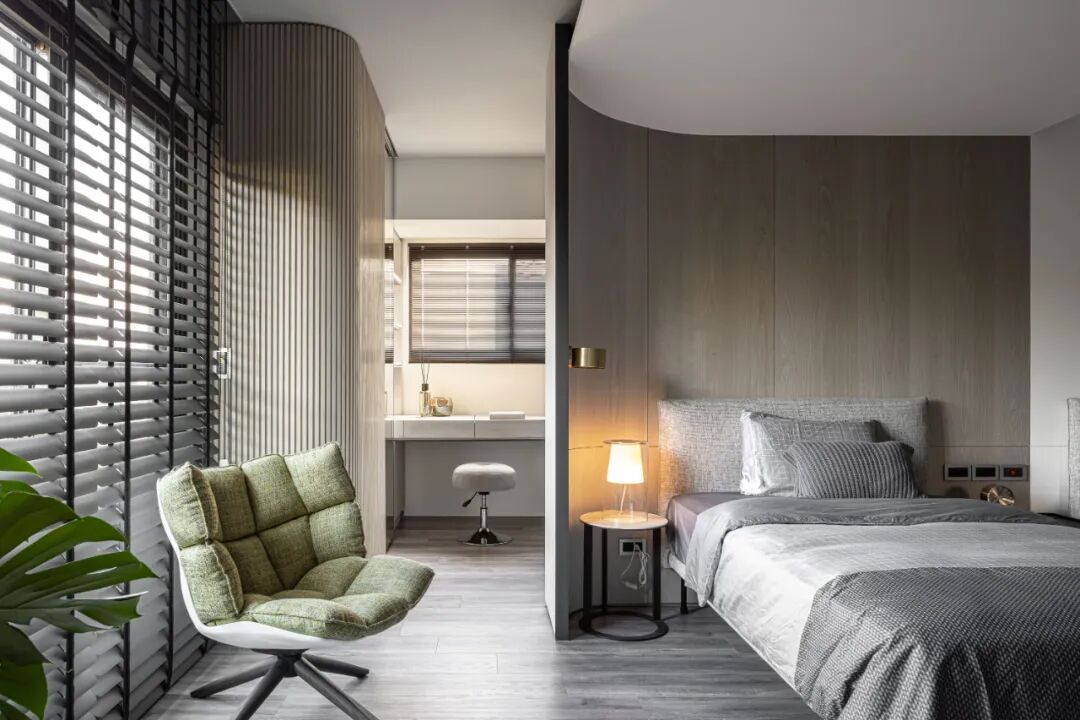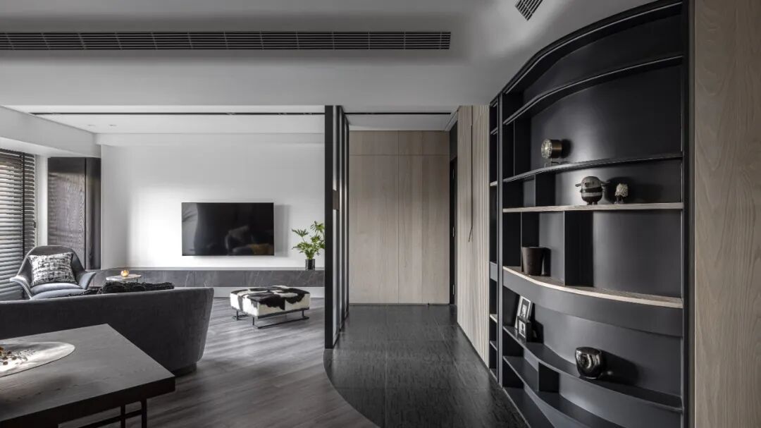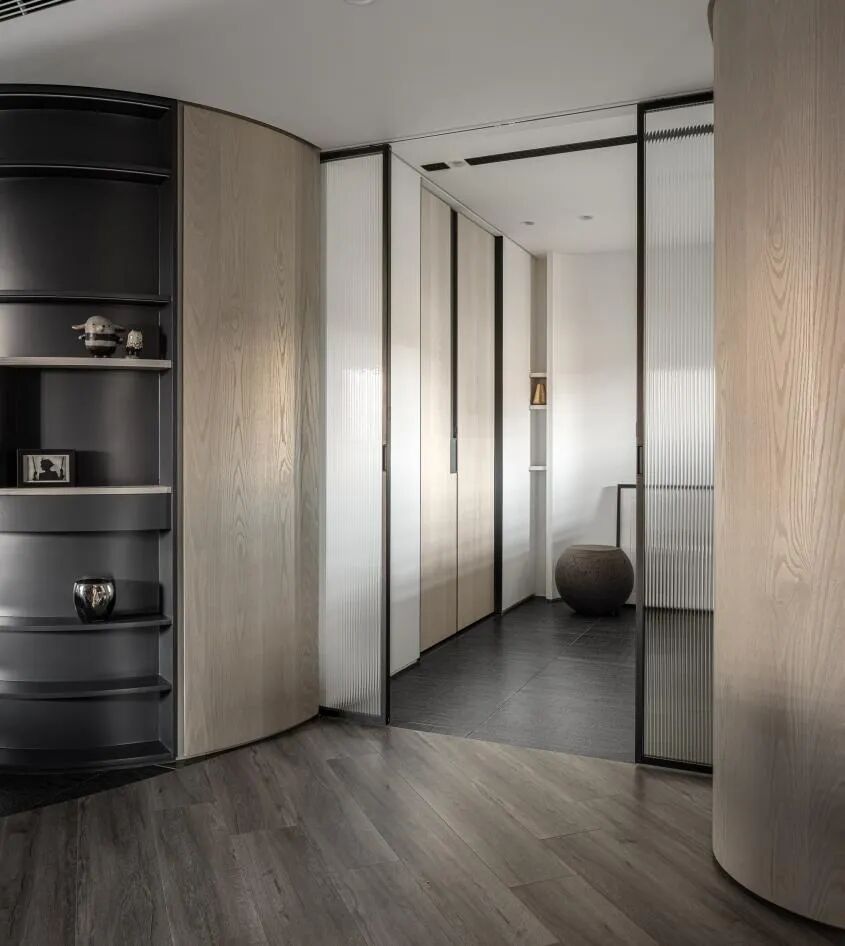 空间的虚实流转随着墙面起承转合,弧形带来空间的流动,空间虽有阻隔,却又融汇贯通。以线和块面对空间进行强有力的分隔,手法概括、简练。材质的区分,细节的刻画,让空间更具美感,更为耐看。