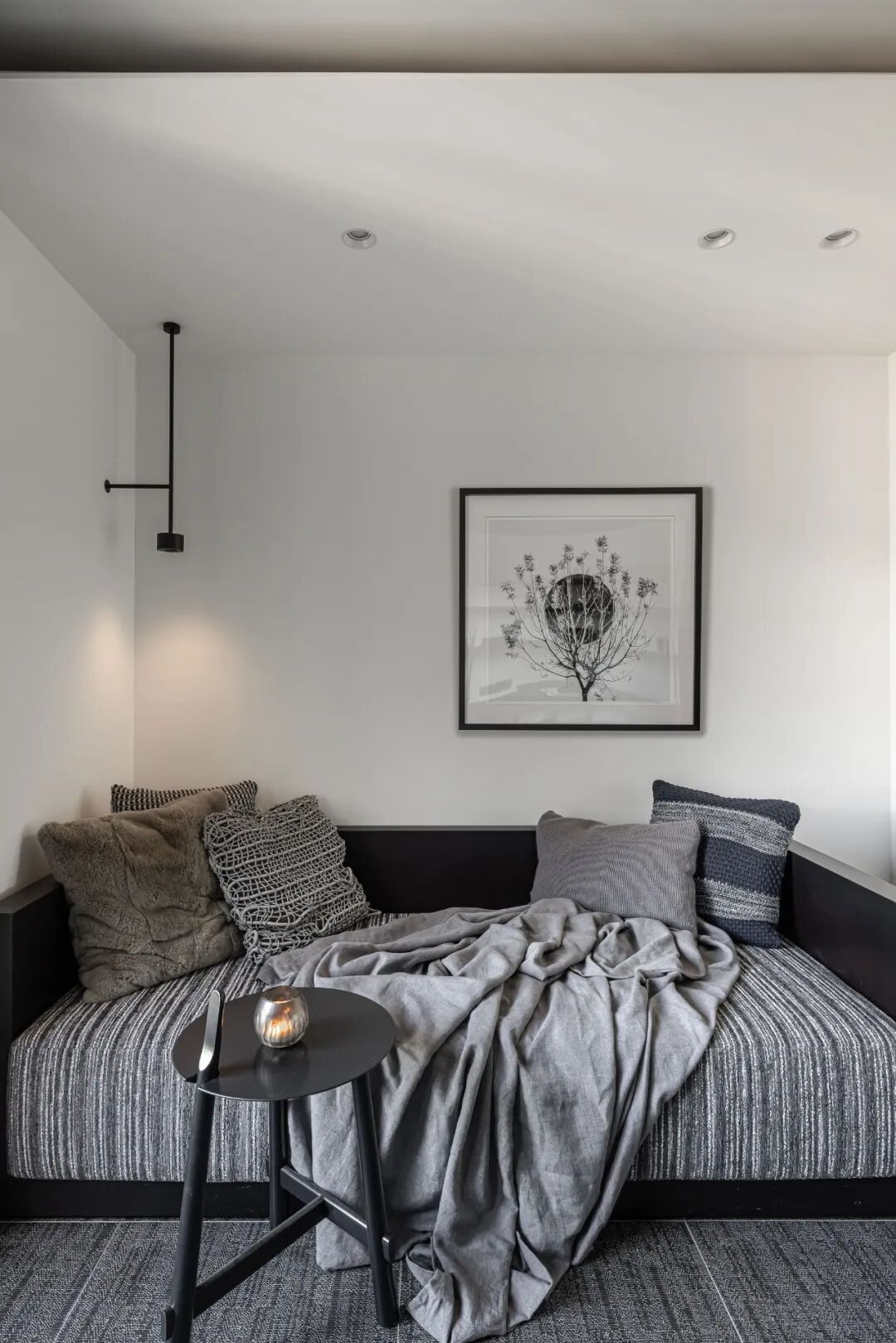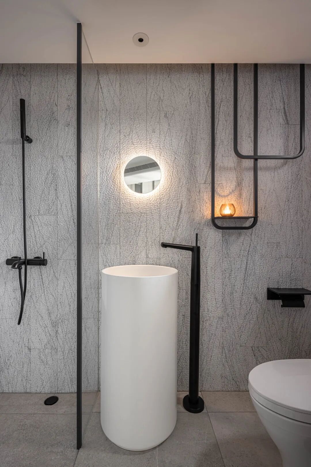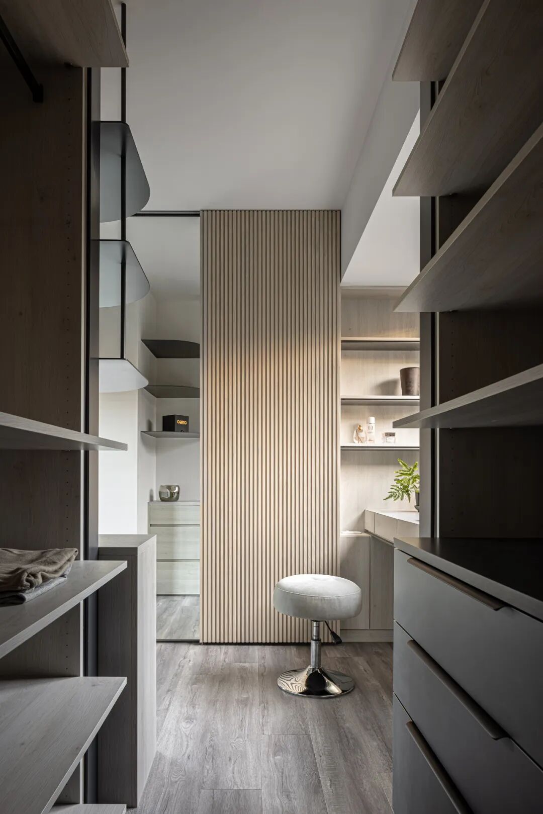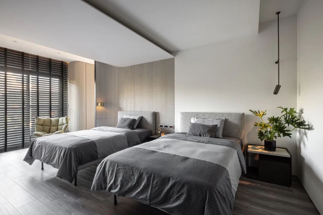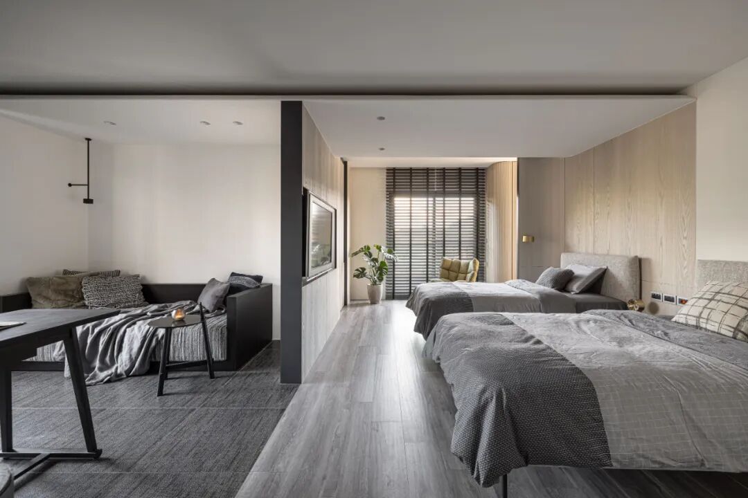 空间的虚实流转随着墙面起承转合,弧形带来空间的流动,空间虽有阻隔,却又融汇贯通。以线和块面对空间进行强有力的分隔,手法概括、简练。材质的区分,细节的刻画,让空间更具美感,更为耐看。