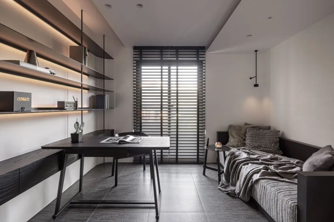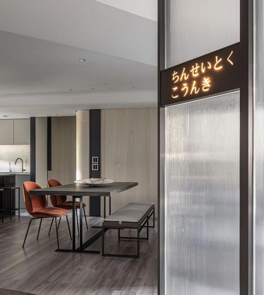金属构件屏风划分场域,透过屏风创造虚实穿透的延伸,界定不同的时空,延续生活的意象,为平凡生活制造些许变化。