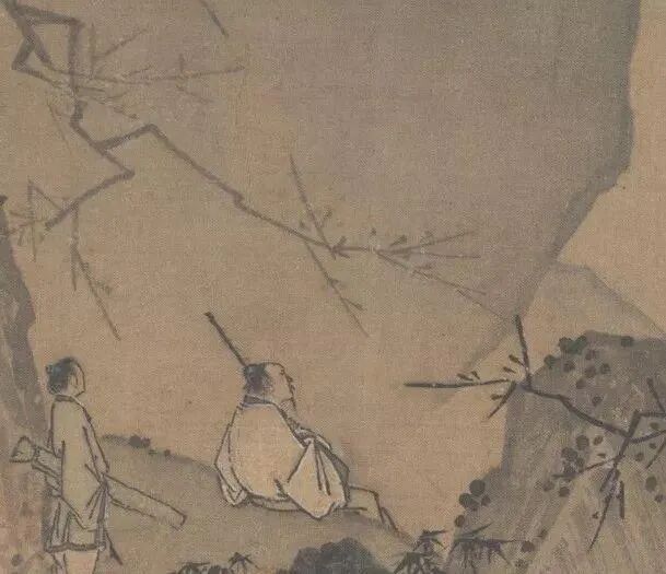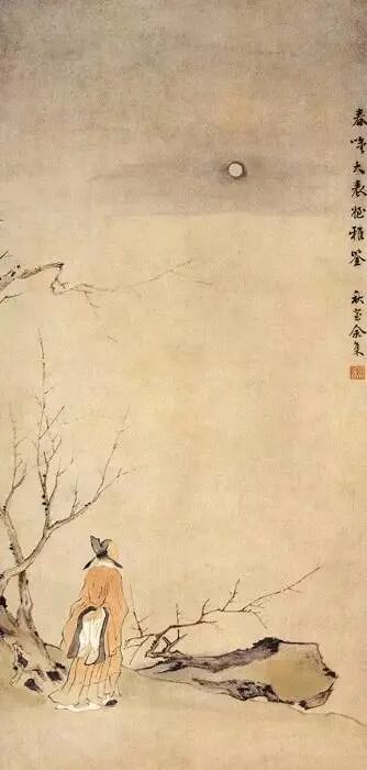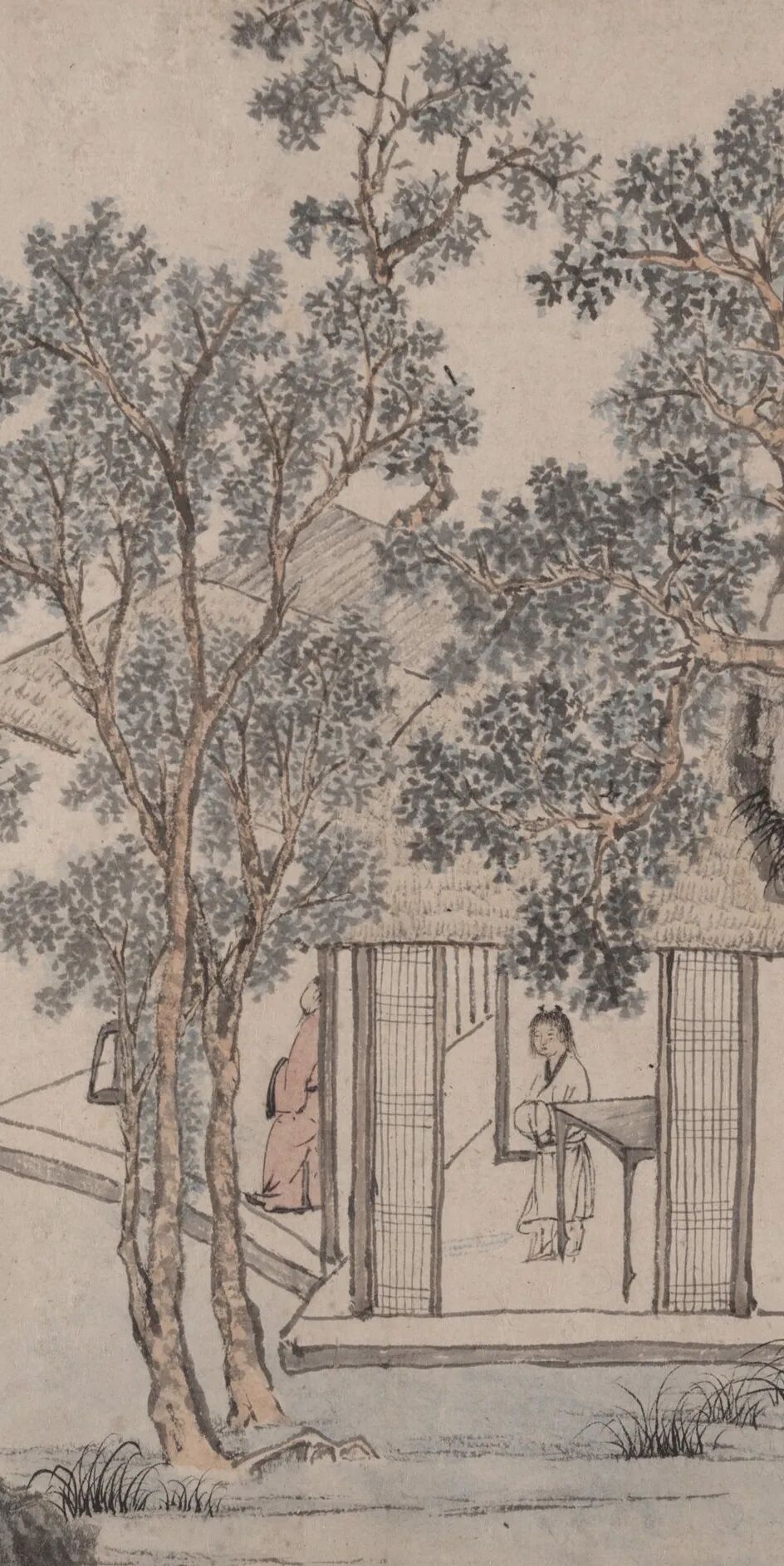 有时,他们会纵情于山水之间。圆月、远山和梅树,都是其他们所喜爱的景象。赏景之时,他们不仅被自然包围,也被自己投射于自然的情绪包围。画中人物身后立一位侍童,书童手中的琴被包裹的很好,没有打开,但它的存在却更显几份静谧。