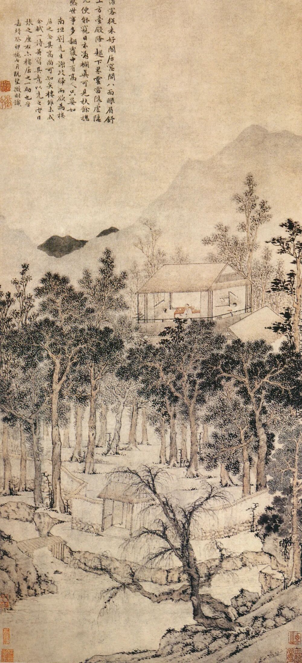 文徵明画中表现出的“闲适自得”不同于官场。这是家乡的庭院与山间的美景,是他思想弛聘的地方,也代表了他与之不同的心境。