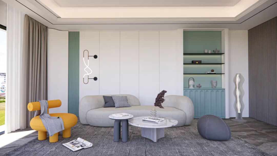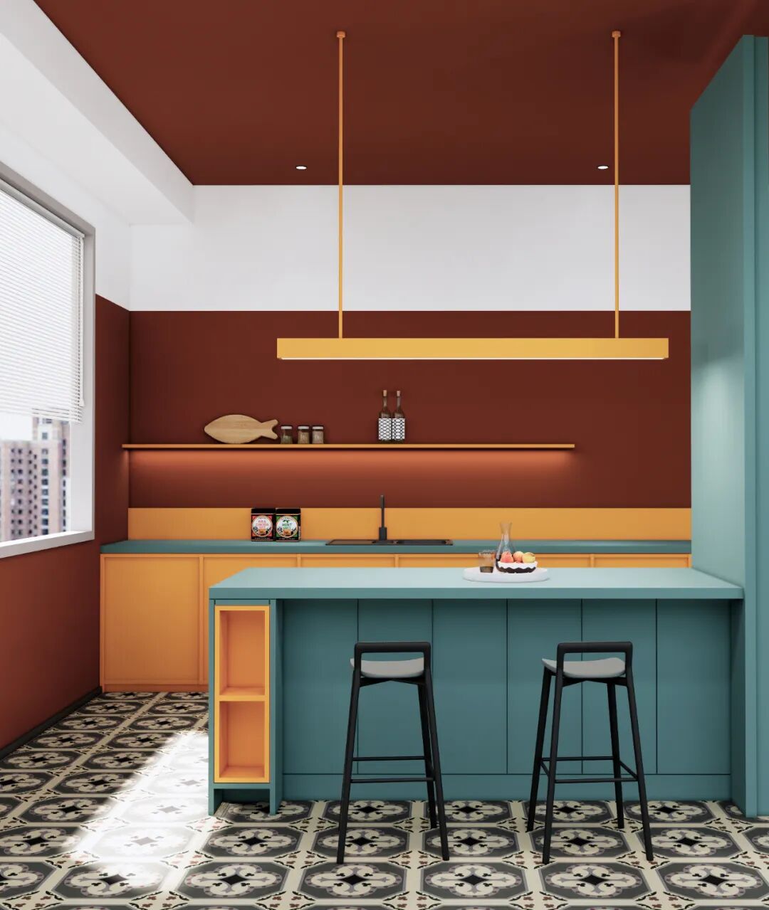 松石绿与扇贝黄、棕锈色的搭配让空间充满艺术气质