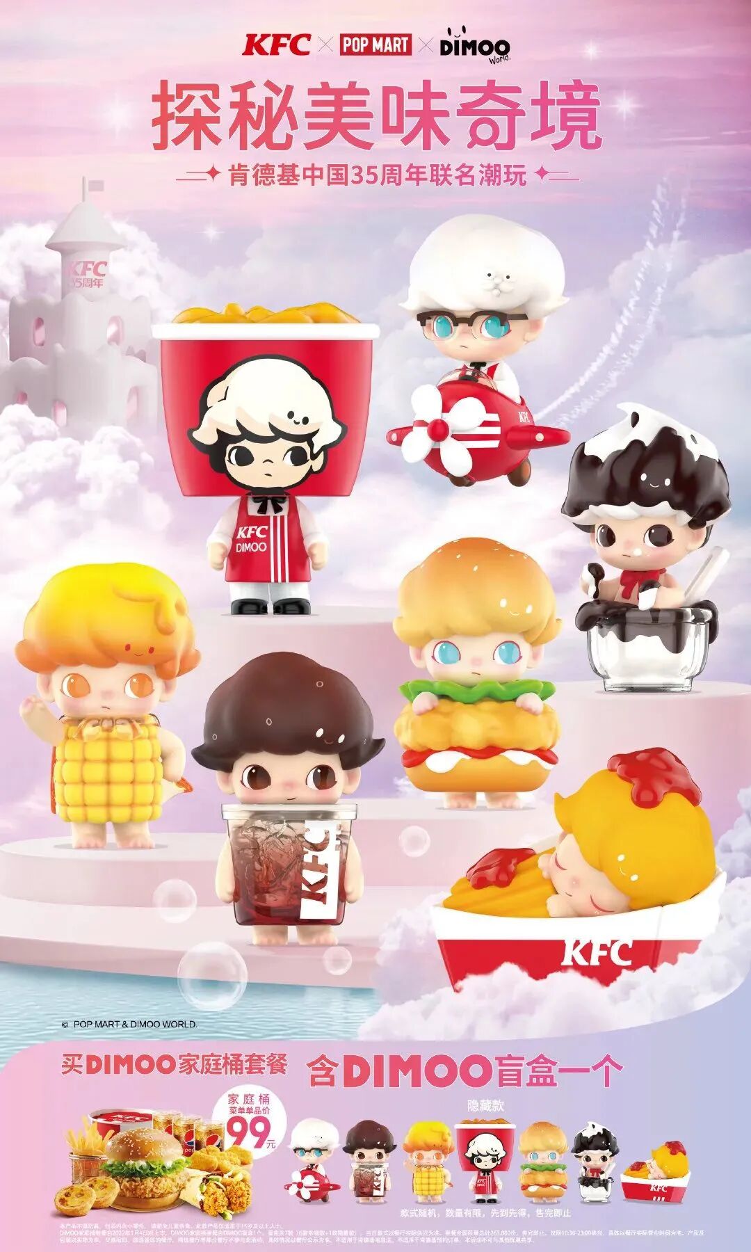 进入中国35周年之际,1月4日,肯德基推出了和Dimoo的联名款盲盒。头顶百变云朵,双眼中透露出对世界充满好奇的小男孩DIMOO,是泡泡玛特最受欢迎的五大头部IP之一。
