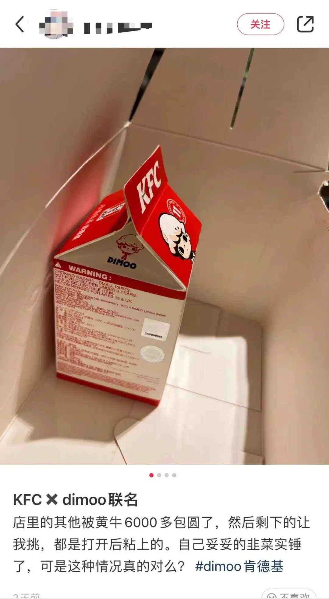 集齐一套盲盒需要至少购买6套全家桶,催生了用户拼单套餐,社交网站上有人发出有人拼单吗的帖子,抽到盲盒算谁的?