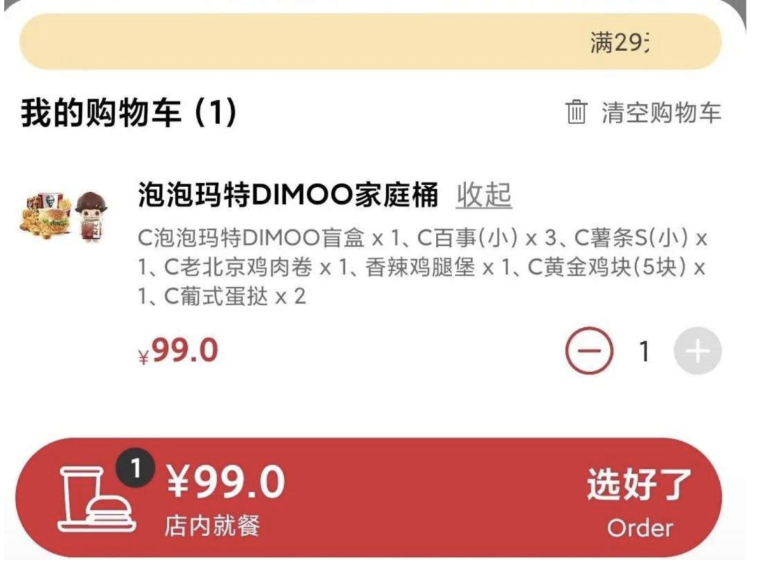 根据规定,消费者只需在肯德基购买价值99元的指定套餐,才能获得盲盒1个。套餐里包含:3个百事小可乐、一份小薯条、一个老北京鸡肉卷、1个香辣鸡腿堡、5块黄金鸡块、2个葡式蛋挞。