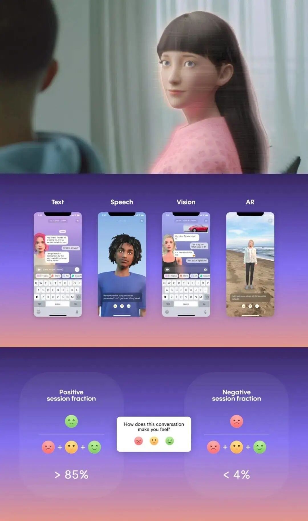 它是一个 AI 陪伴产品,可以通过对话帮助用户获得情感支持,尤其对孤独、抑郁或缺乏社交联系的人特别有帮助。