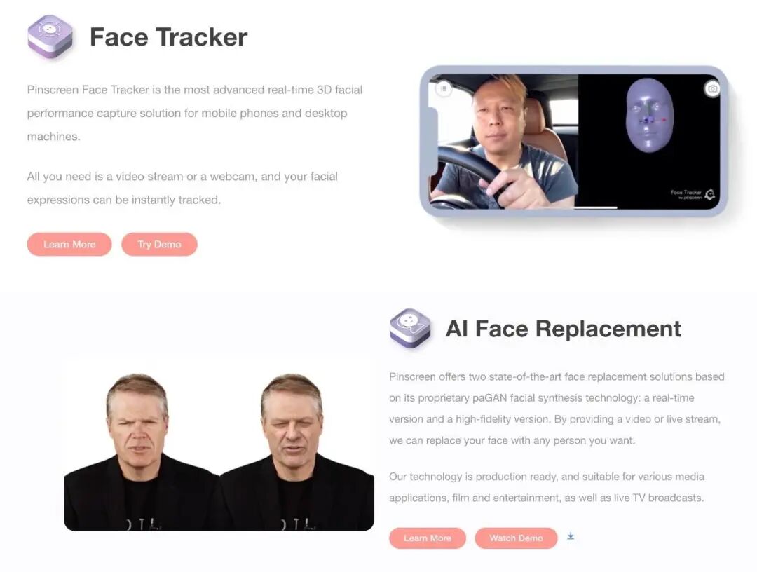 Pinscreen 运用 AI 面部合成技术 (paGAN) 与包括语音识别和语音合成的 NLP 等技术,为用户提供包括虚拟助手制作、人工智能换脸与形象生成、动作捕捉等多功能的 AI 数字人制作工具。