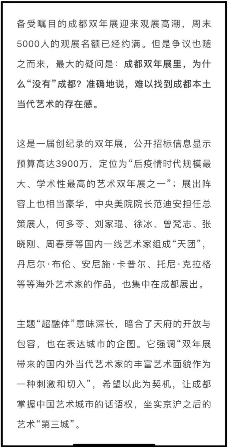其实双年展是怎么回事,大家都心知肚明得很家人们,都知道是纯纯的一个根本就没有讨论的必要的大状态。成都双年展也不一定必须要有成都的家人们啊家人们。但是,我还是要支持和捍卫成都艺术家发声的权利,属于一个立此为证的大动作。