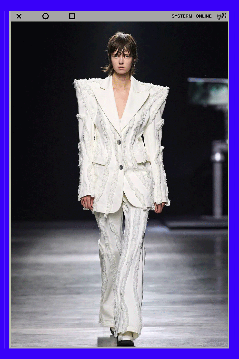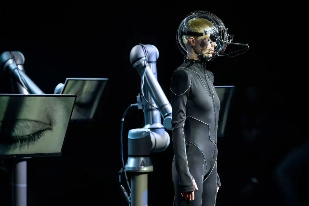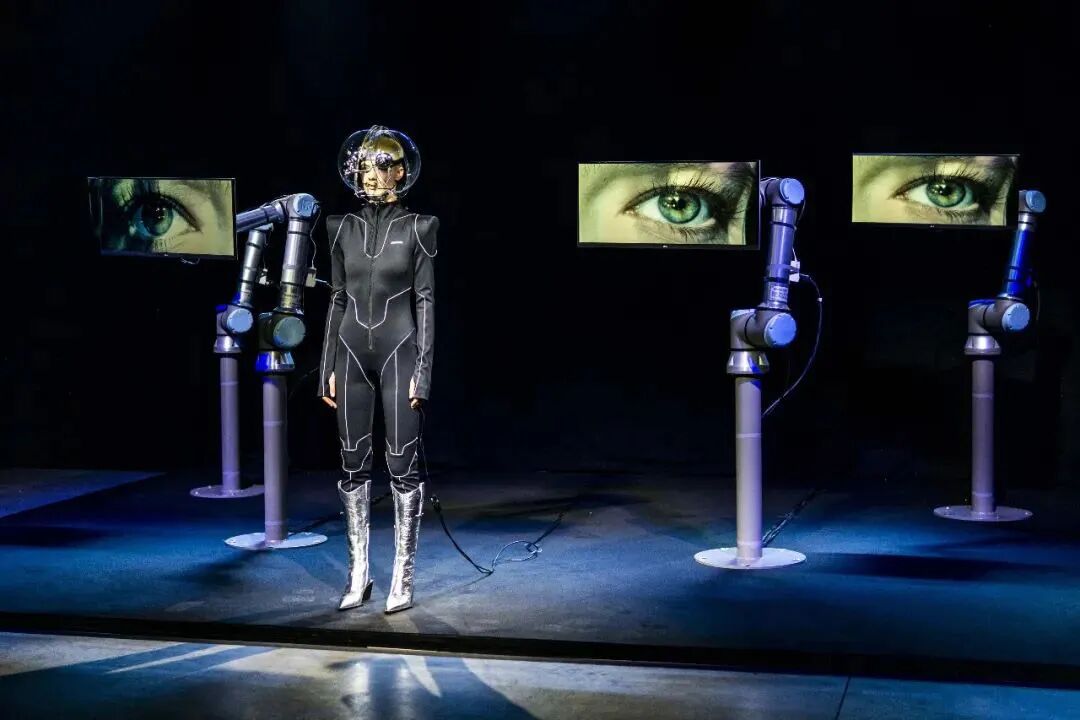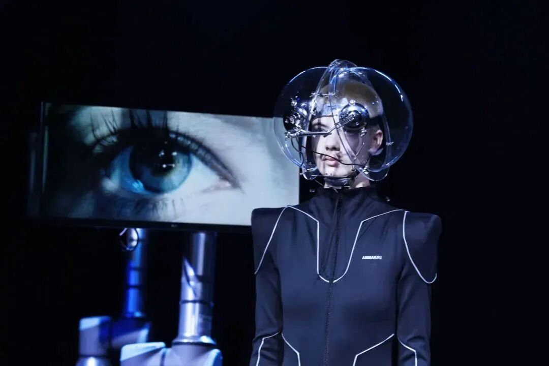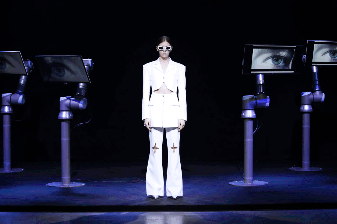 ANNAKIKI在米兰时装周秀场中打造了艺术装置作品《反向凝视》(Returning the Gaze),机械巨手连接的显示器里是模特被放大的眼睛影像,指代具有增强视觉功能的机械眼的“后人类”。