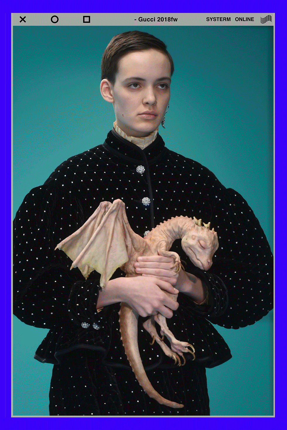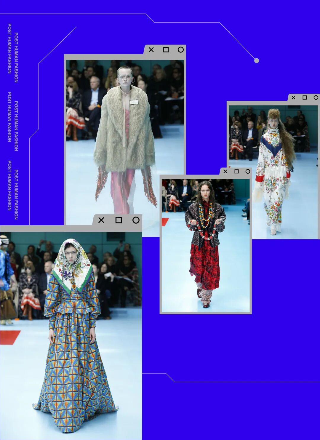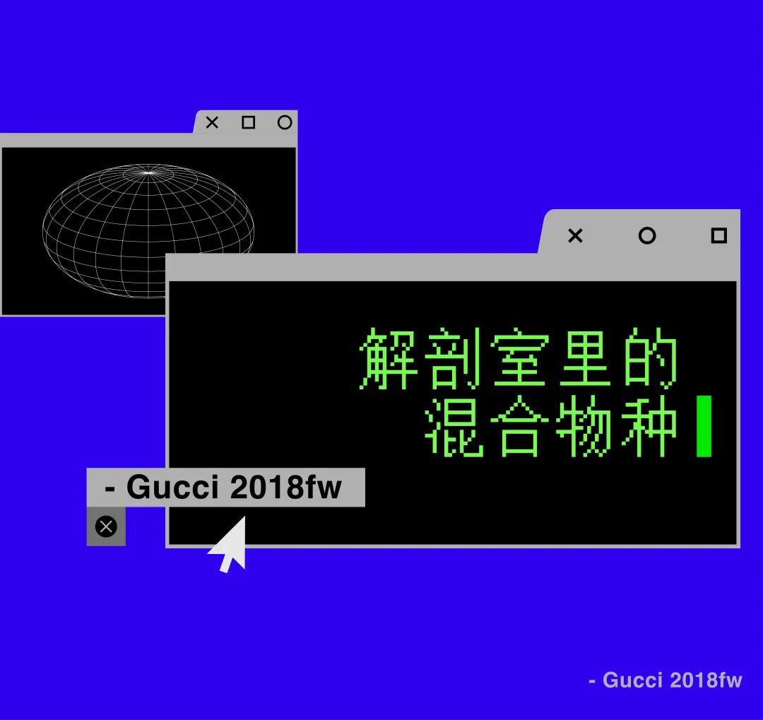Gucci 2018fw的大秀无疑是许多设计师了解“后人类”的开始!Alessandro Michele从进化的角度解释何为 “Transmar”和“Cyborg”,模特手上抱着自己的头颅,幼龙、珊瑚蛇、变色龙,亦或是头上长角,额上生出第三只眼,包含混种身份的隐喻;多民族多时代服装的混搭,像是复古凉亭帽与现代薄纱服装组合,体现 “后人类”们作为信息载体的重组与融合。