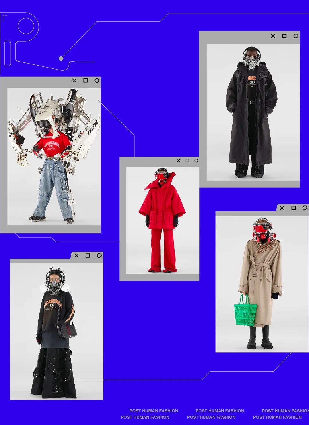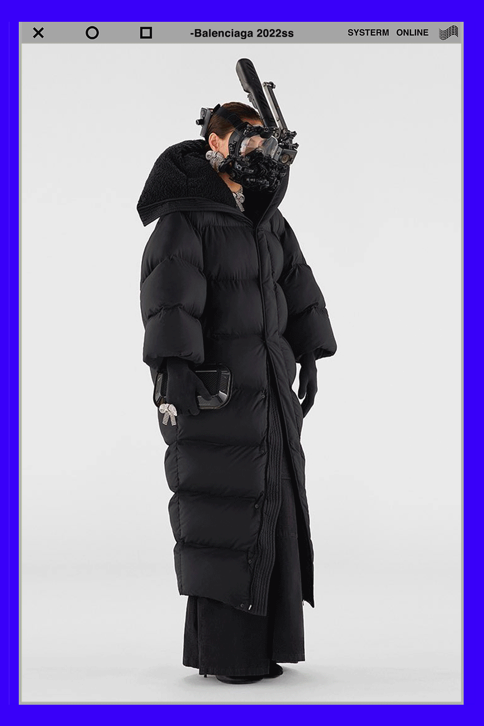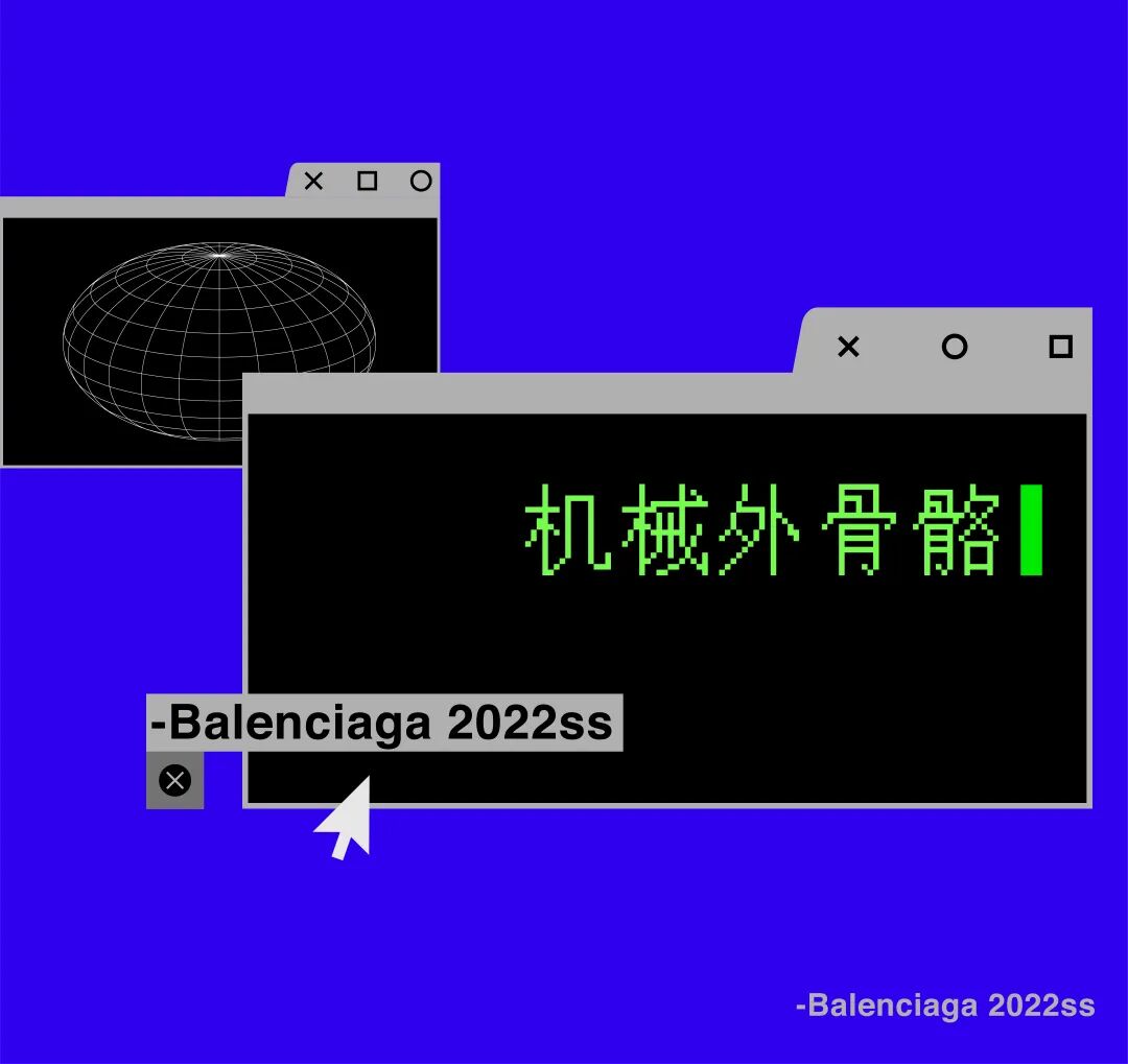 Balenciaga 2022年春夏系列与日本新锐模型艺术家 IKEUCHI Hiroto 池内启人合作,模特们都戴上了精密的机械面罩,其中一位模特穿戴的巨大的机械外骨骼装甲是最具视觉震撼力的装备。该装备设想通过装甲提高人体机能,最终实现人机一体化。