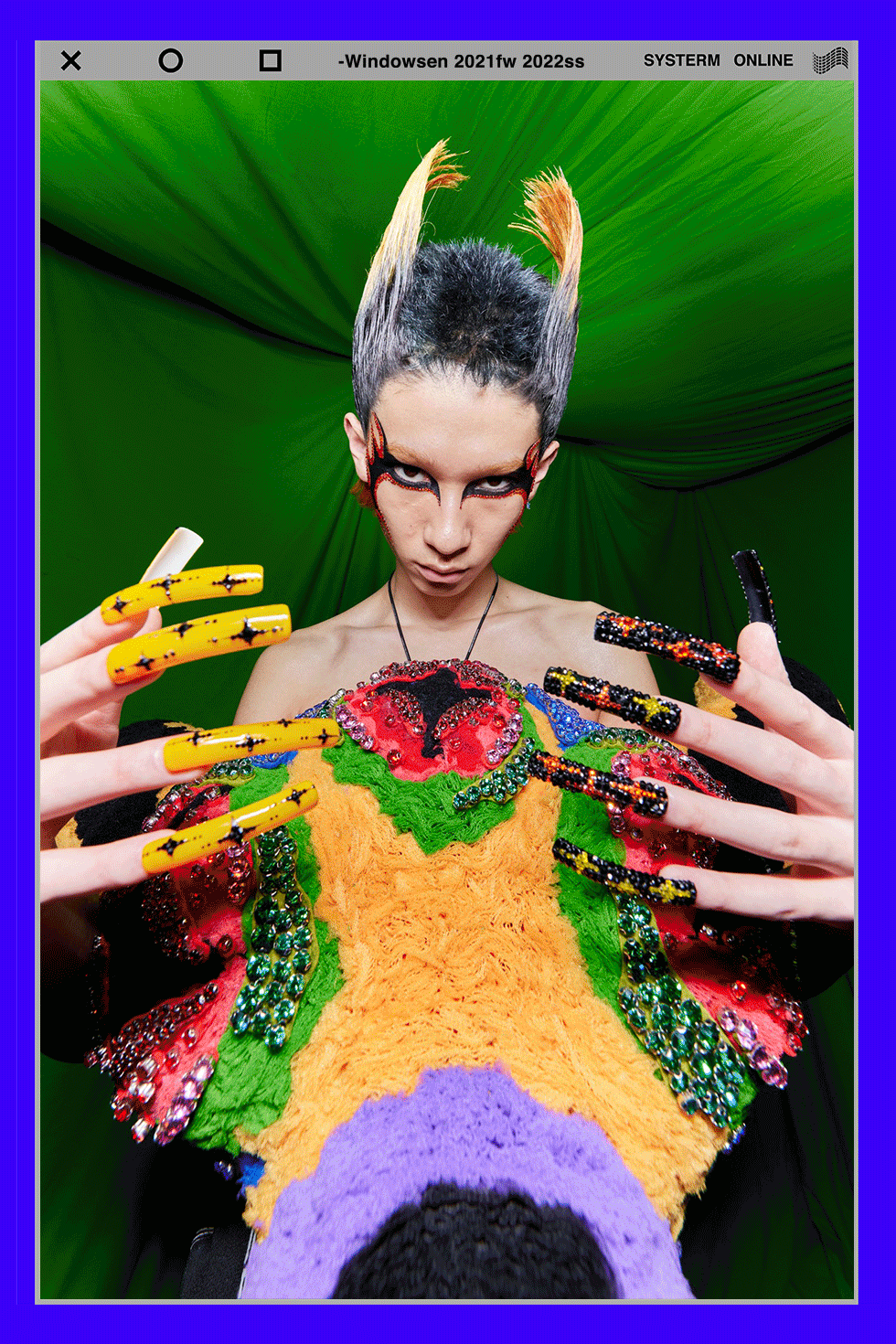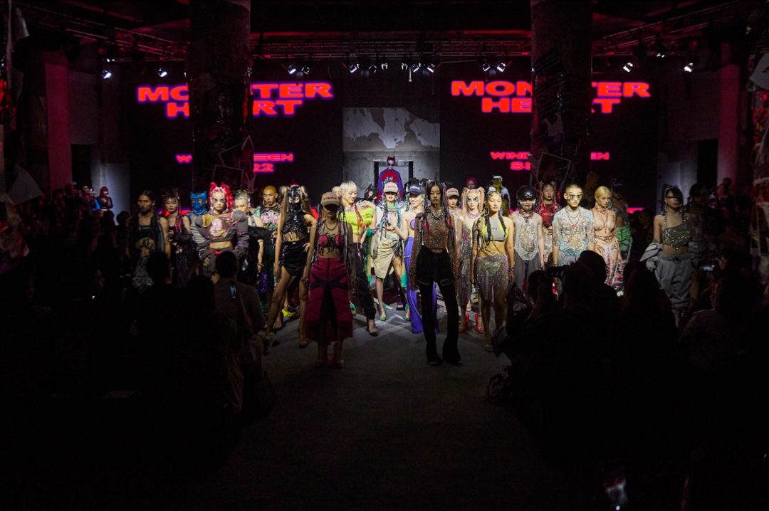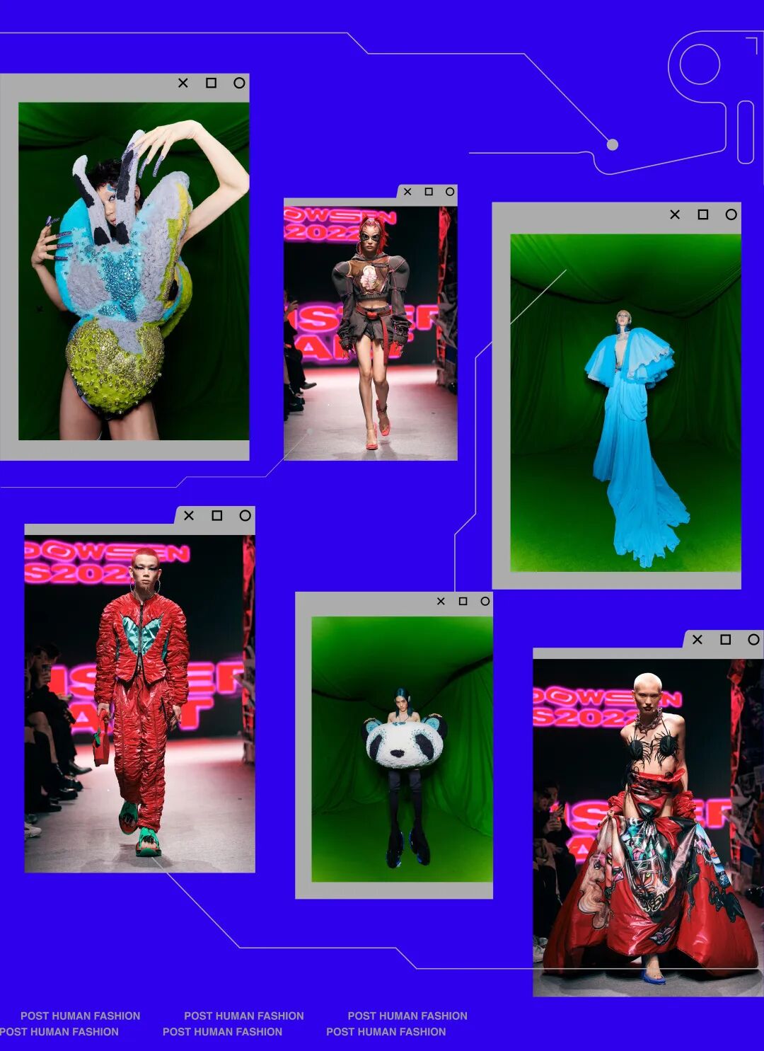Windowsen 强烈的视觉色彩冲突和巨型外观构成了他独有的“后人类”形象宇宙。2021年秋冬「Barbie with the Chinese Zodiac」系列中,将传统的十二生肖完全颠覆,夸张变形廓形创造出模糊性别,色彩斑澜,自信绽放的生物体。2022春夏「Monster Heart」系列则是半机械人,仿生人的天下,锁链缠绕着镶有水晶的贴身长袍,如同变形金刚式的机械靴,营造出一个高科技的反乌托邦世界。