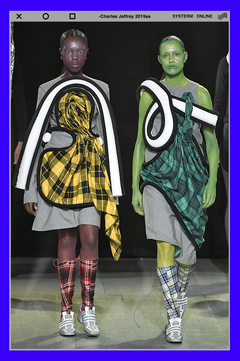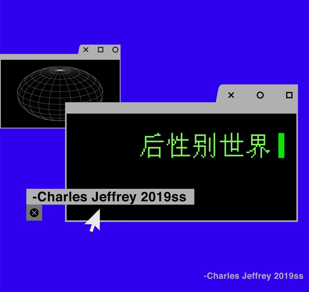 圣马丁鬼才设计师Charles Jeffrey风格怪诞,充满幻想。2019春夏“Emergence” 系列为"LGBTQ+"群体发声,和Gucci相似,模特的鼻梁额头由硅胶重塑,将人类面部特征改写。科幻元素也融入设计中,未来主义风格的星体造型头饰,银箔覆盖的套装,雕塑式的古怪廓形和仿生妆容,Jeffrey向观众展示未来愿景的方式:“一个充斥着星尘的后性别世界”,每个人都可以自由地拥抱未经过滤的,不完美的自我。