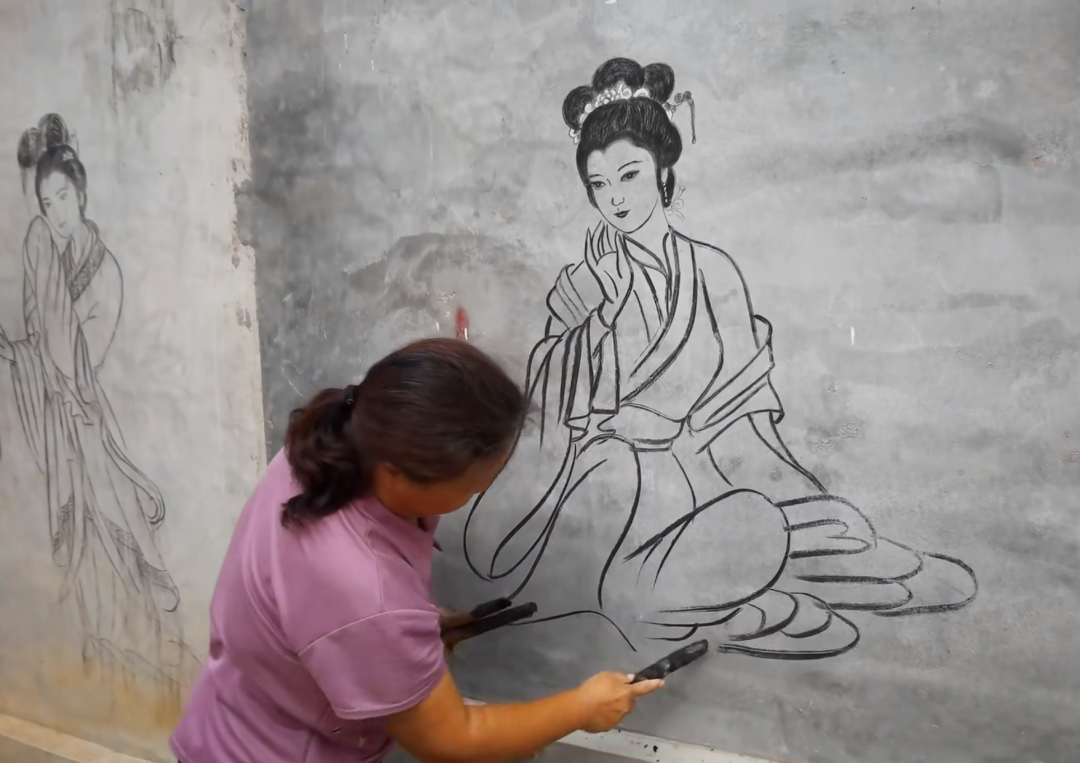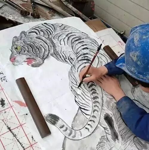为了画作逼真,他用水泥打底之后