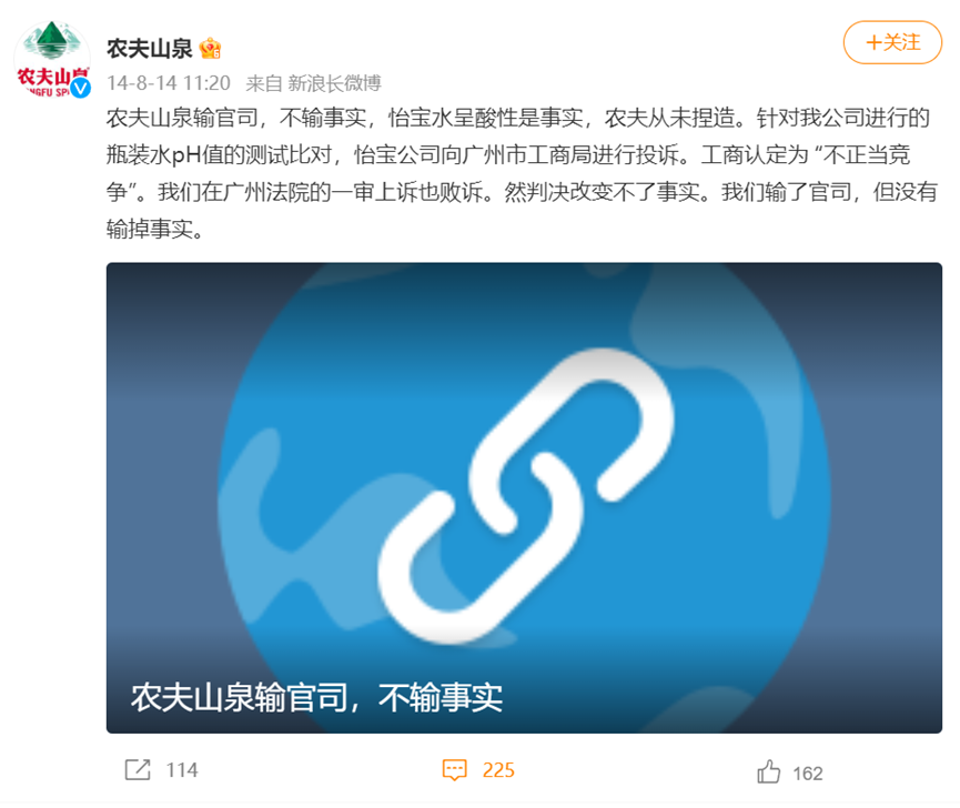 在微博平台,农夫山泉发表文章《农夫山泉输官司,不输事实》,放出三大点向怡宝进攻。其一,怡宝纯净水水源为当地自来水;其二,怡宝纯净水呈弱酸性;其三,怡宝纯净水不含矿物质。