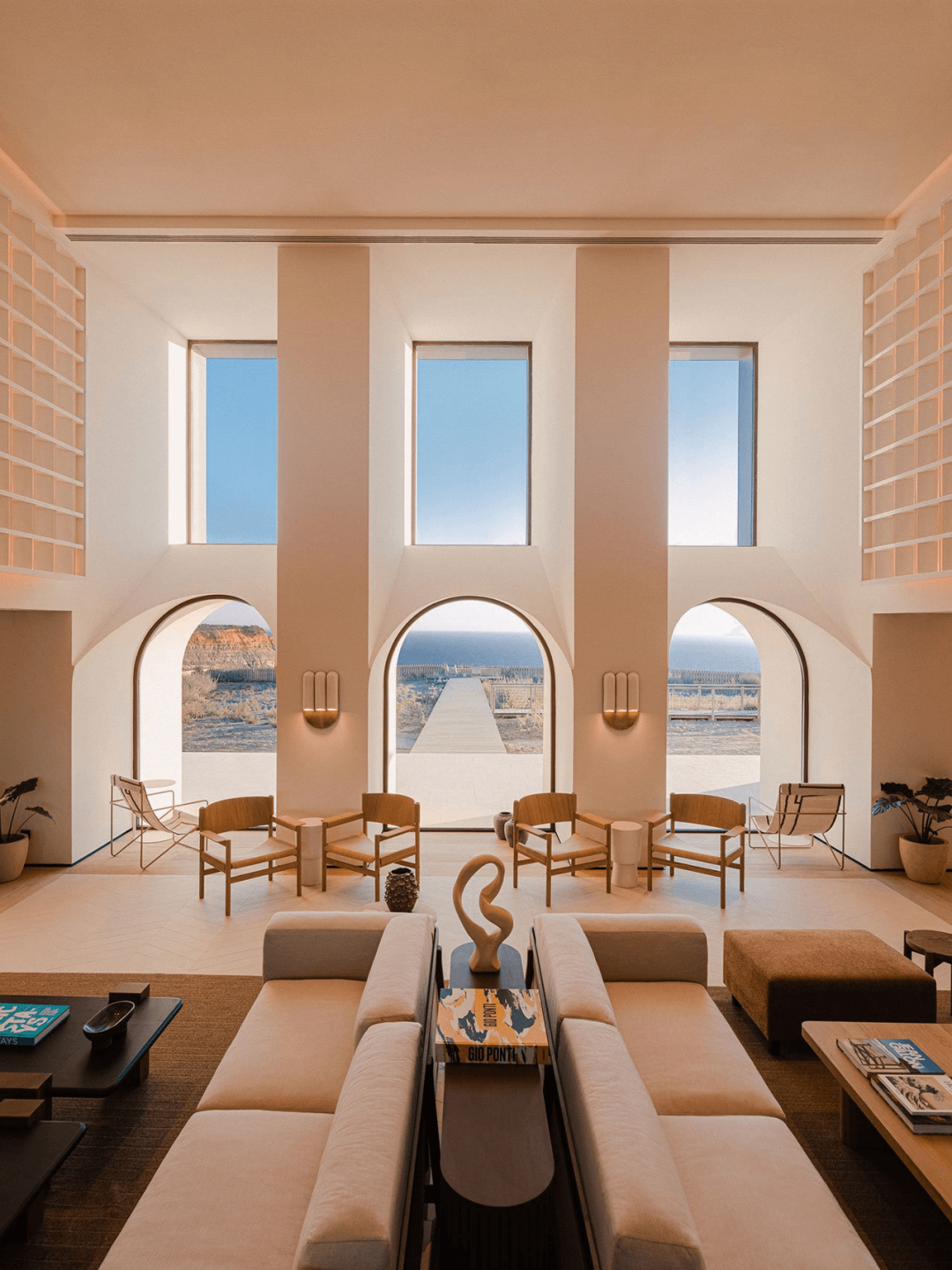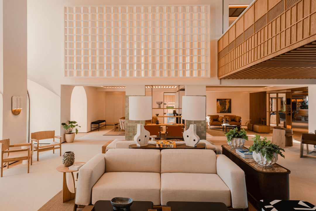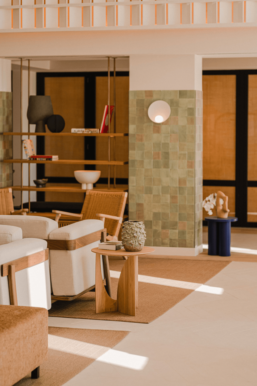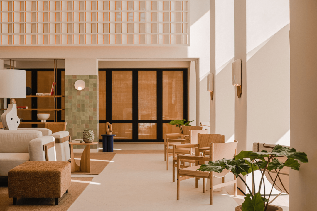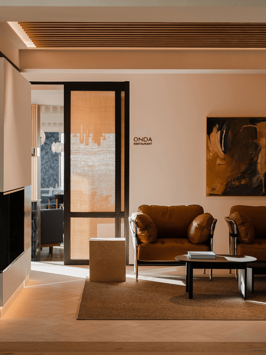 酒店的公共区,设计师想要一个温暖舒适的空间,朴实的木制色调,但又加入一些艺术设计元素,并且又能完美和海景融合。