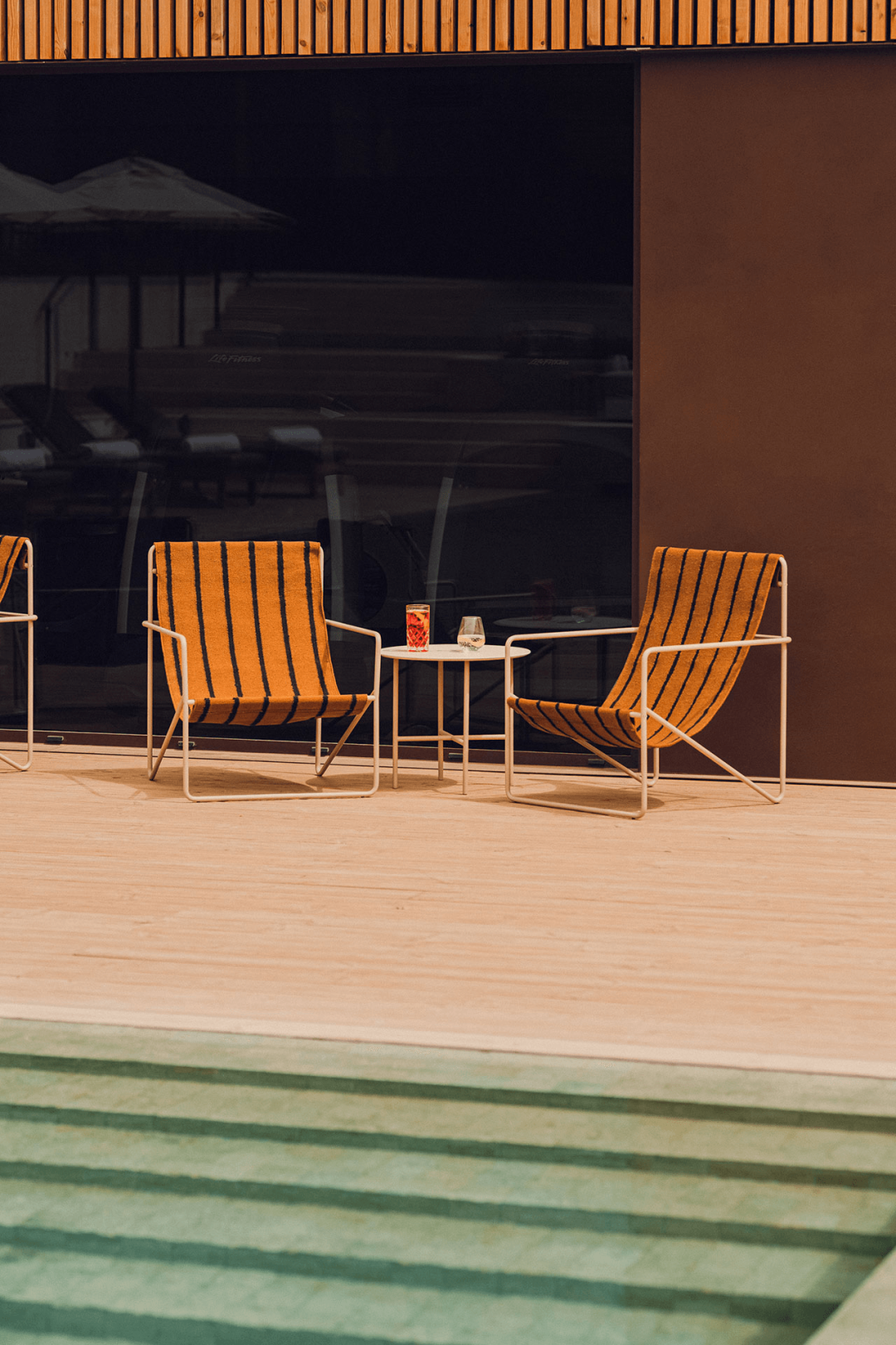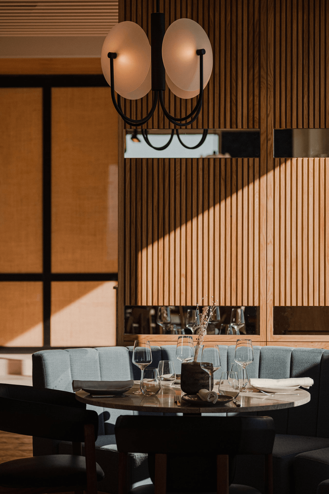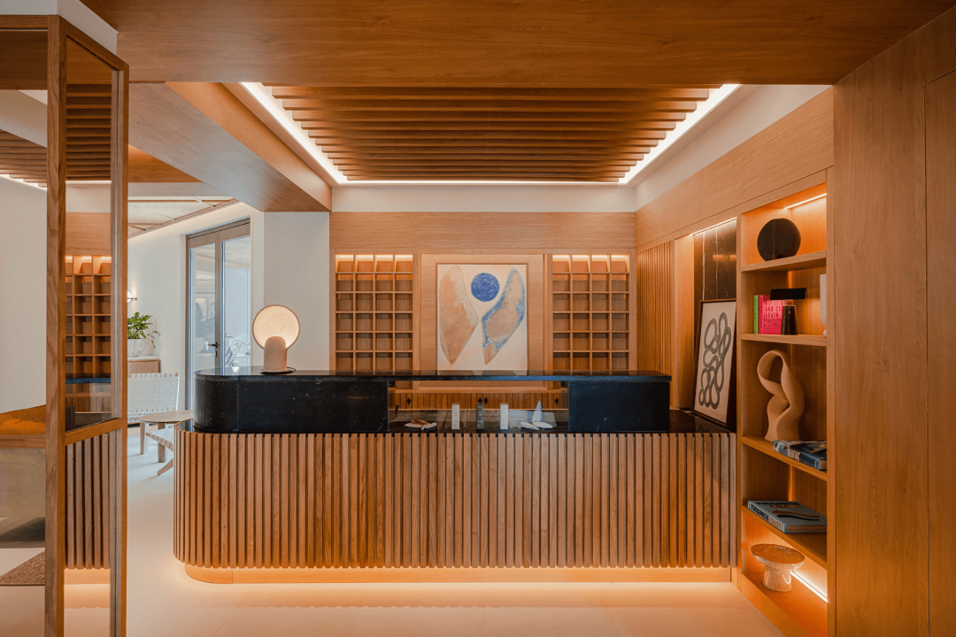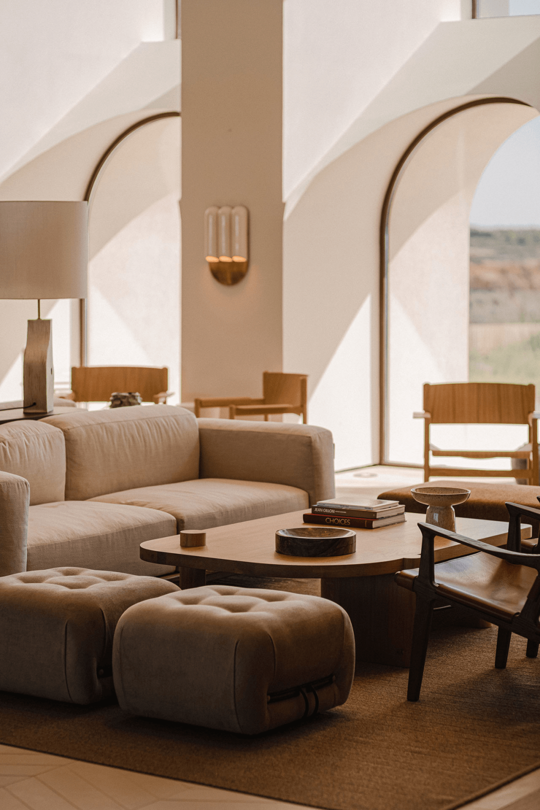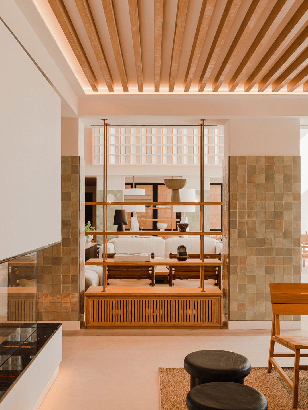酒店的公共区,设计师想要一个温暖舒适的空间,朴实的木制色调,但又加入一些艺术设计元素,并且又能完美和海景融合。