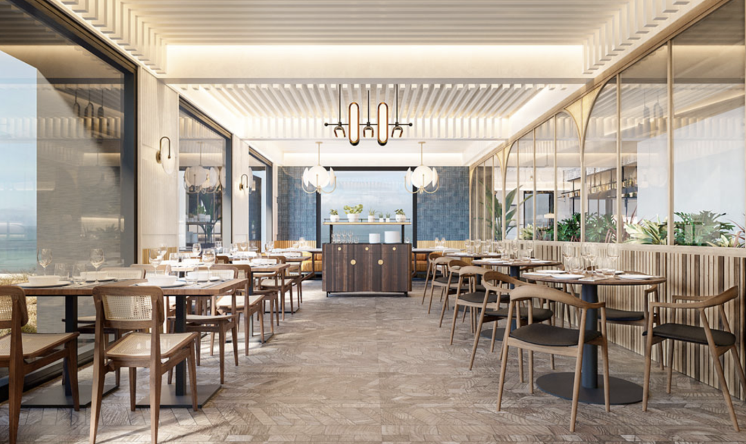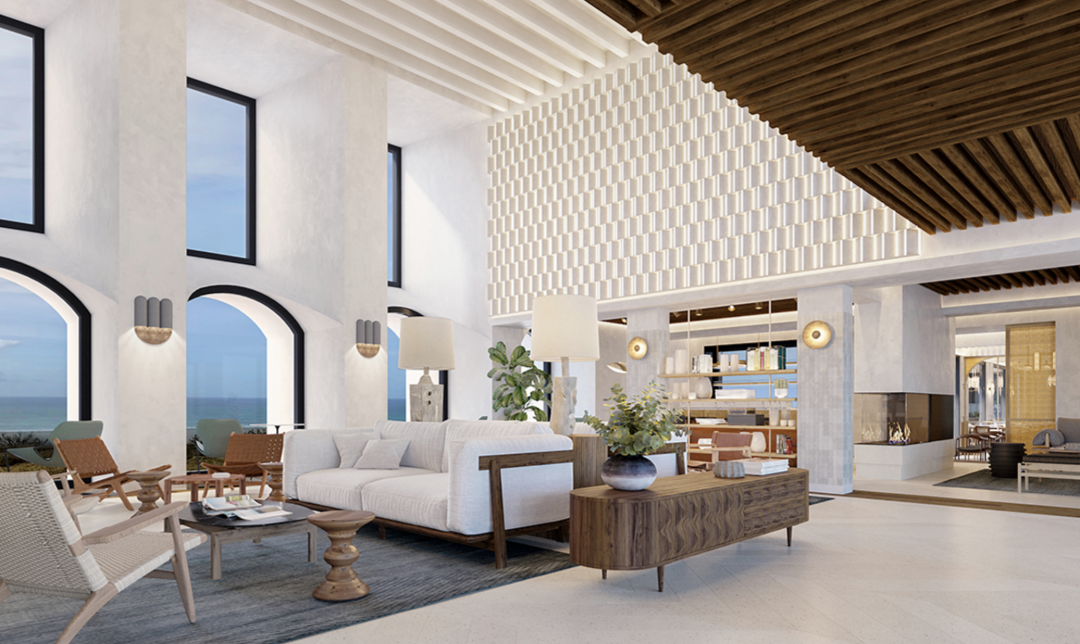 酒店的公共区,设计师想要一个温暖舒适的空间,朴实的木制色调,但又加入一些艺术设计元素,并且又能完美和海景融合。
