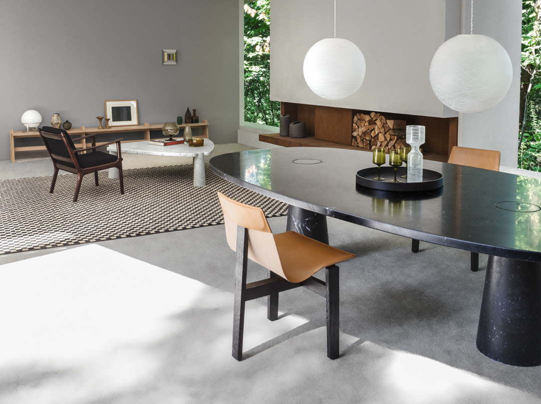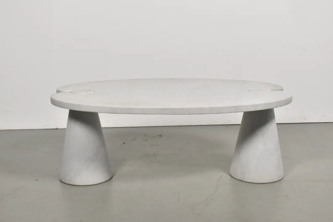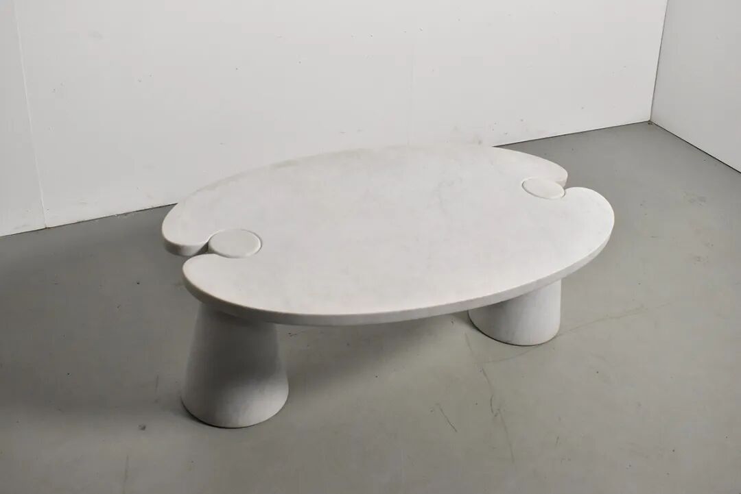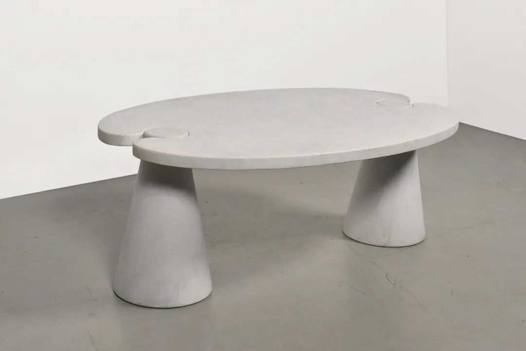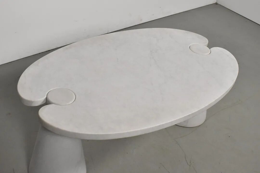 Angelo Mangiarotti 的这款雕塑桌是后现代设计的巧妙典范。桌子是用白色大理石制成的。椭圆形桌面没有接头或夹子,其结构具有建筑风格。