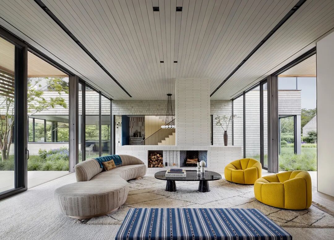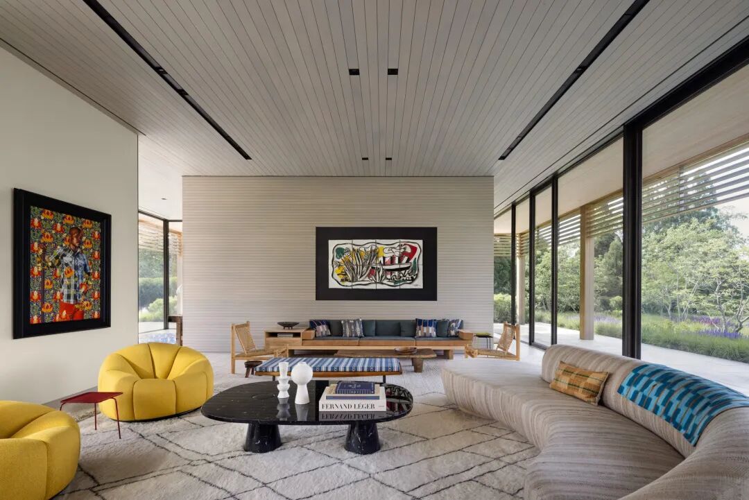 客厅配有Pierre Paulin 设计的两把明黄色的 Elysee 扶手椅、Vladimir Kagan 沙发。打造出兼具度假和温暖的居家氛围,背景墙有2幅大的艺术插画极具异国风情。