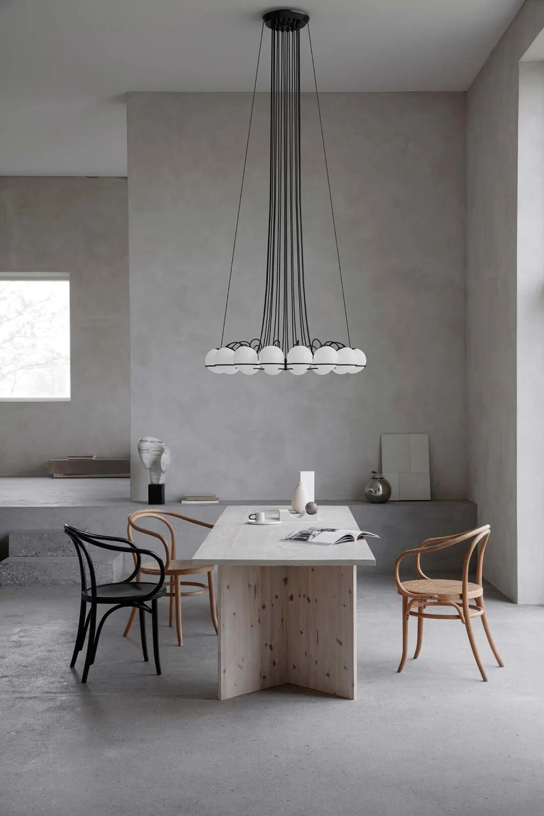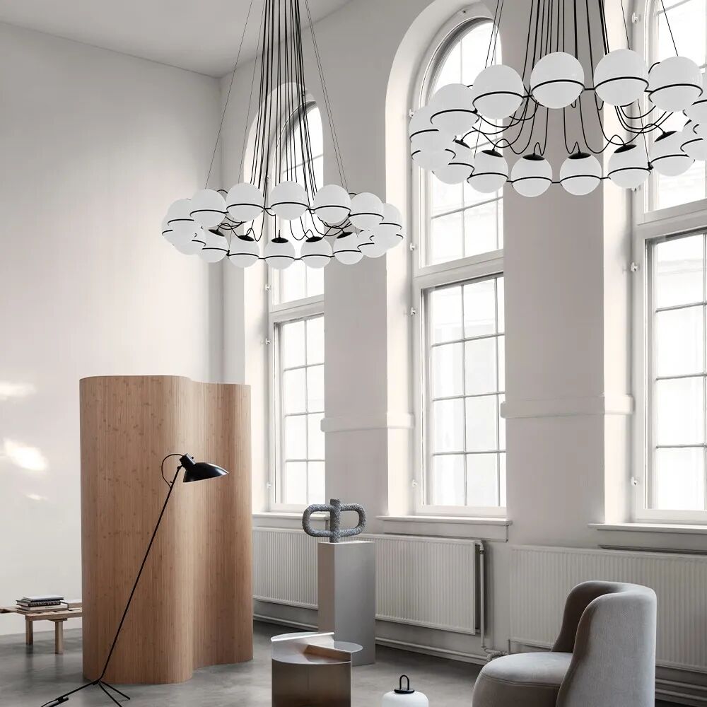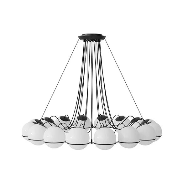 Le Sfere 枝形吊灯由吹制乳白色玻璃球的圆形阵列组成。每个球体都由一个大型黑色或香槟色钢径向环结构固定到位。