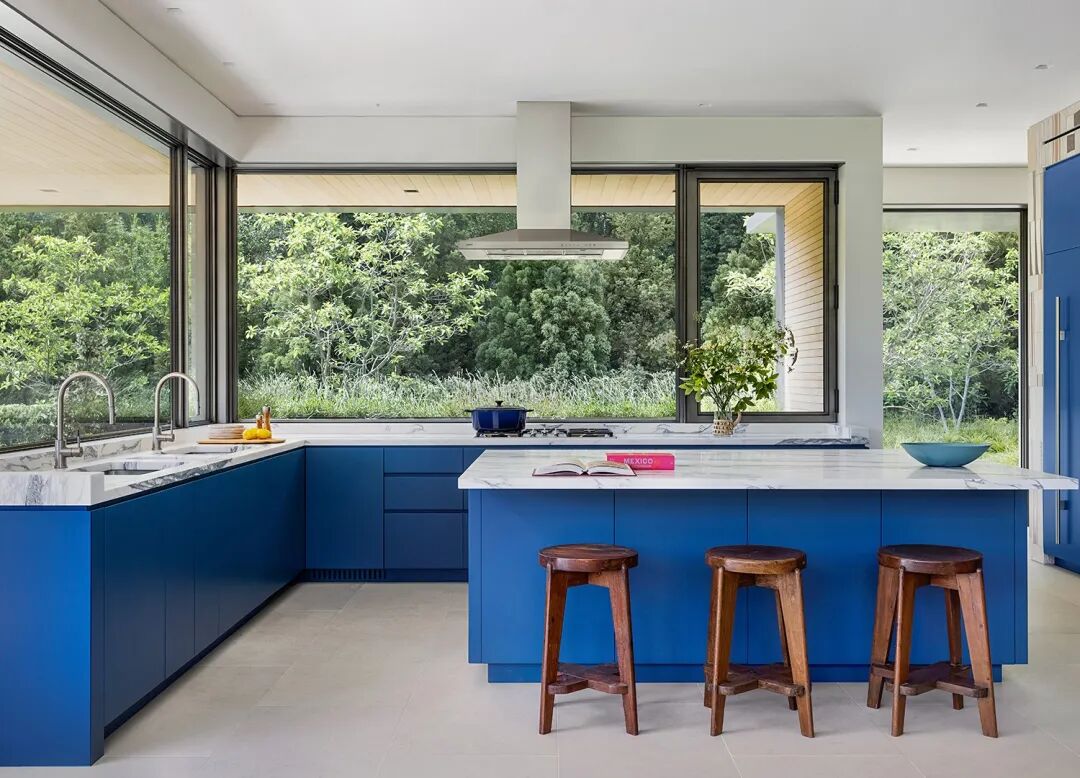 厨房距离用餐露台、烤架和菜园仅几步之遥,房主可在此享受明亮的早晨阳光。克莱因蓝搭配着白色的大理石台面,又多了一份静谧之感。