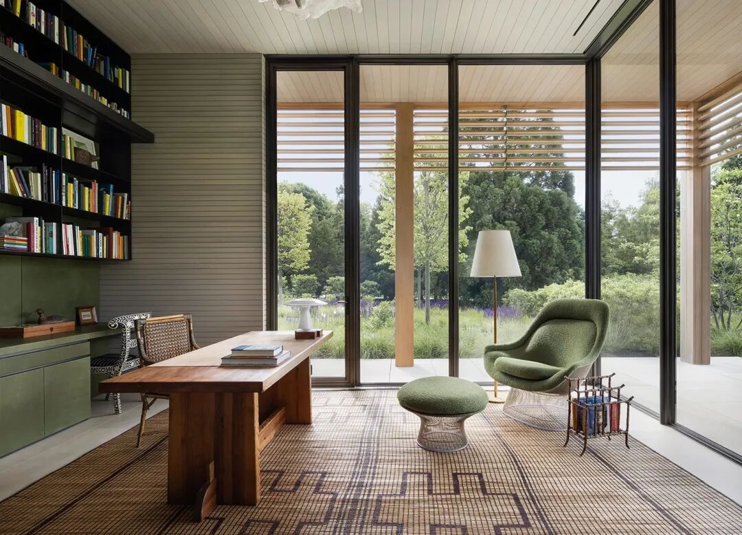 阅读区由简明的绿色搭配着木色调,两扇大大的玻璃门外就是青葱的树林。阅读累了,随时可以欣赏到窗外的有机花园。