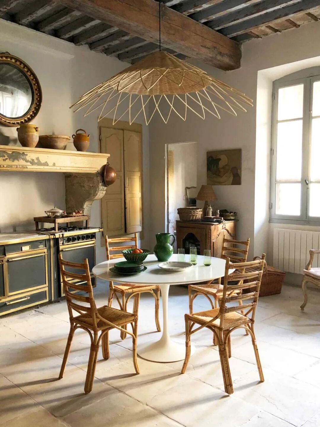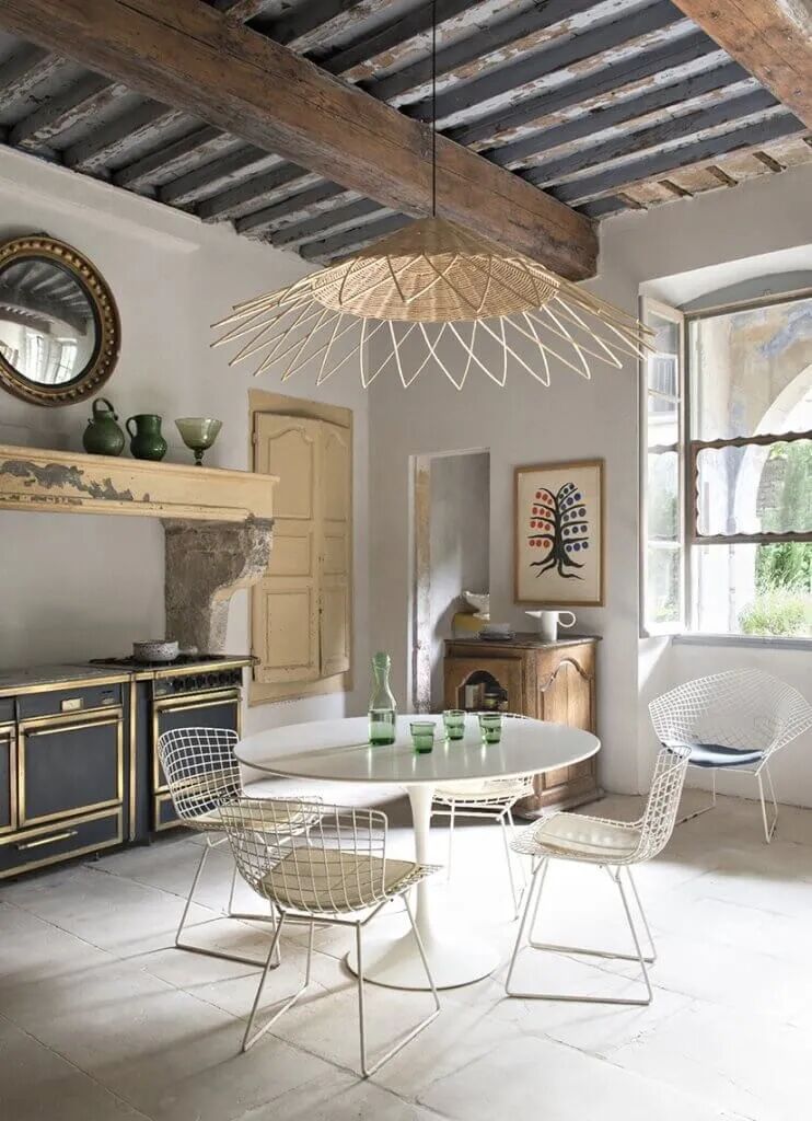 由Knoll Tulip 椅子包围的定制长椅座椅在家庭功能中嵌入了灵活性。同时,由 Atelier Vime 设计的自然有机形状的吊坠是上面的焦点。