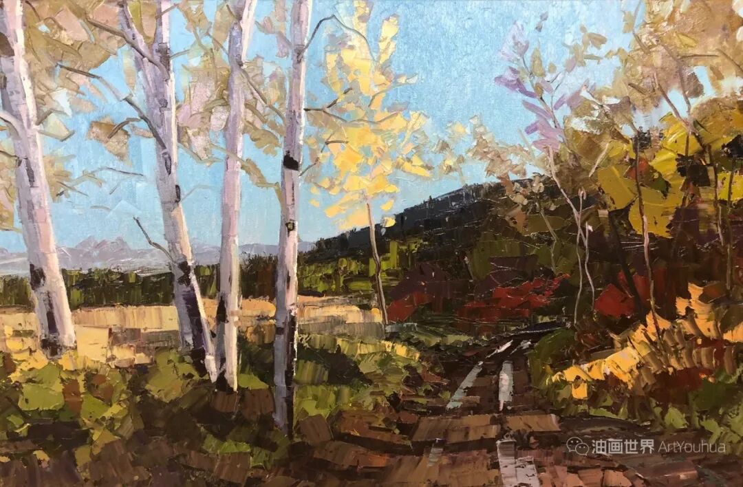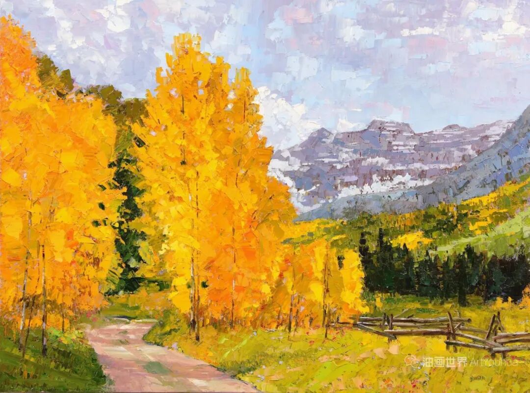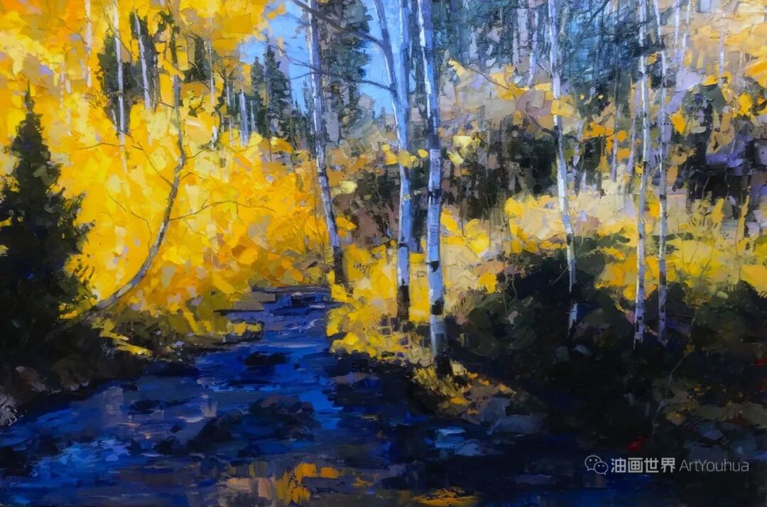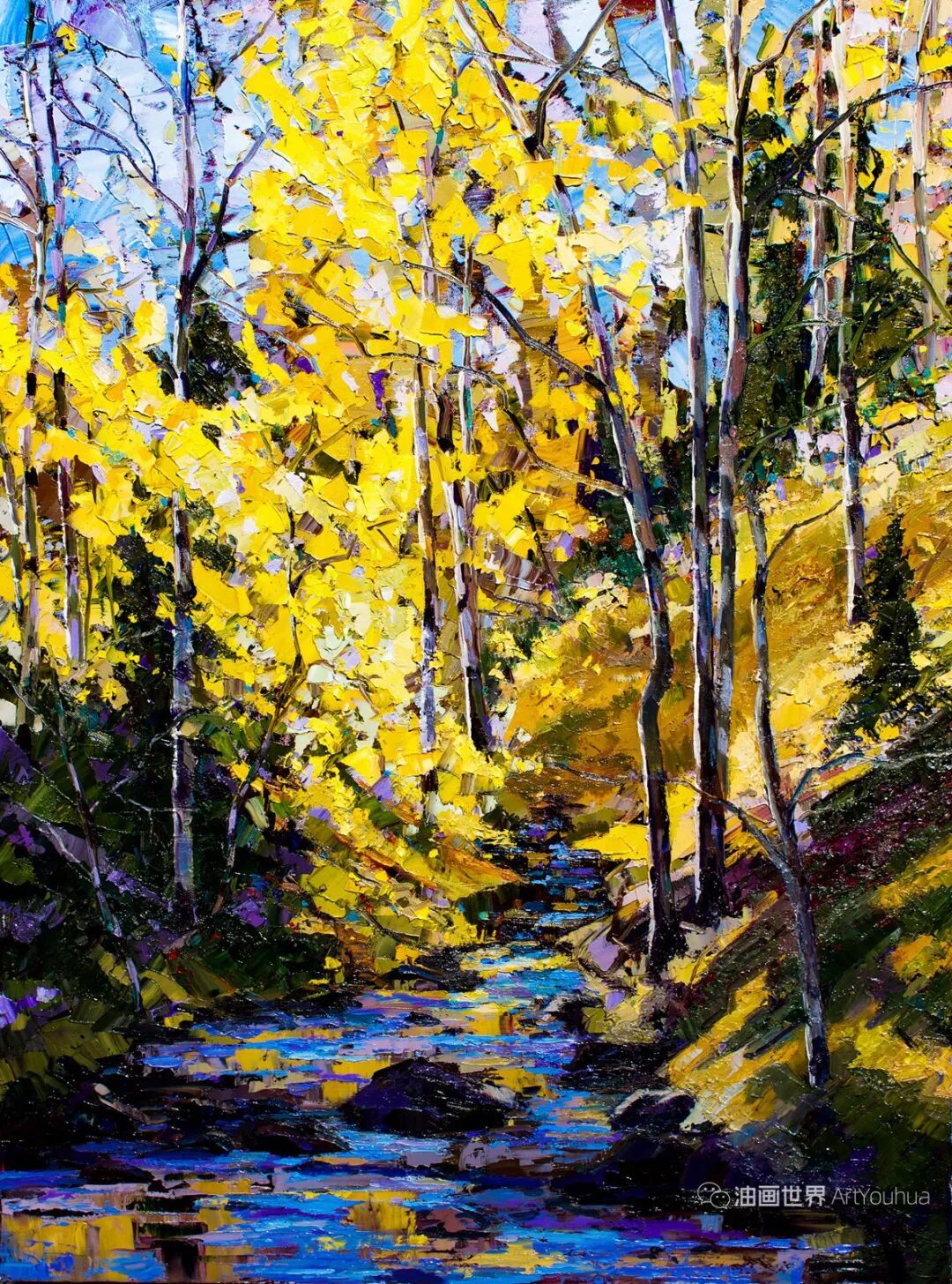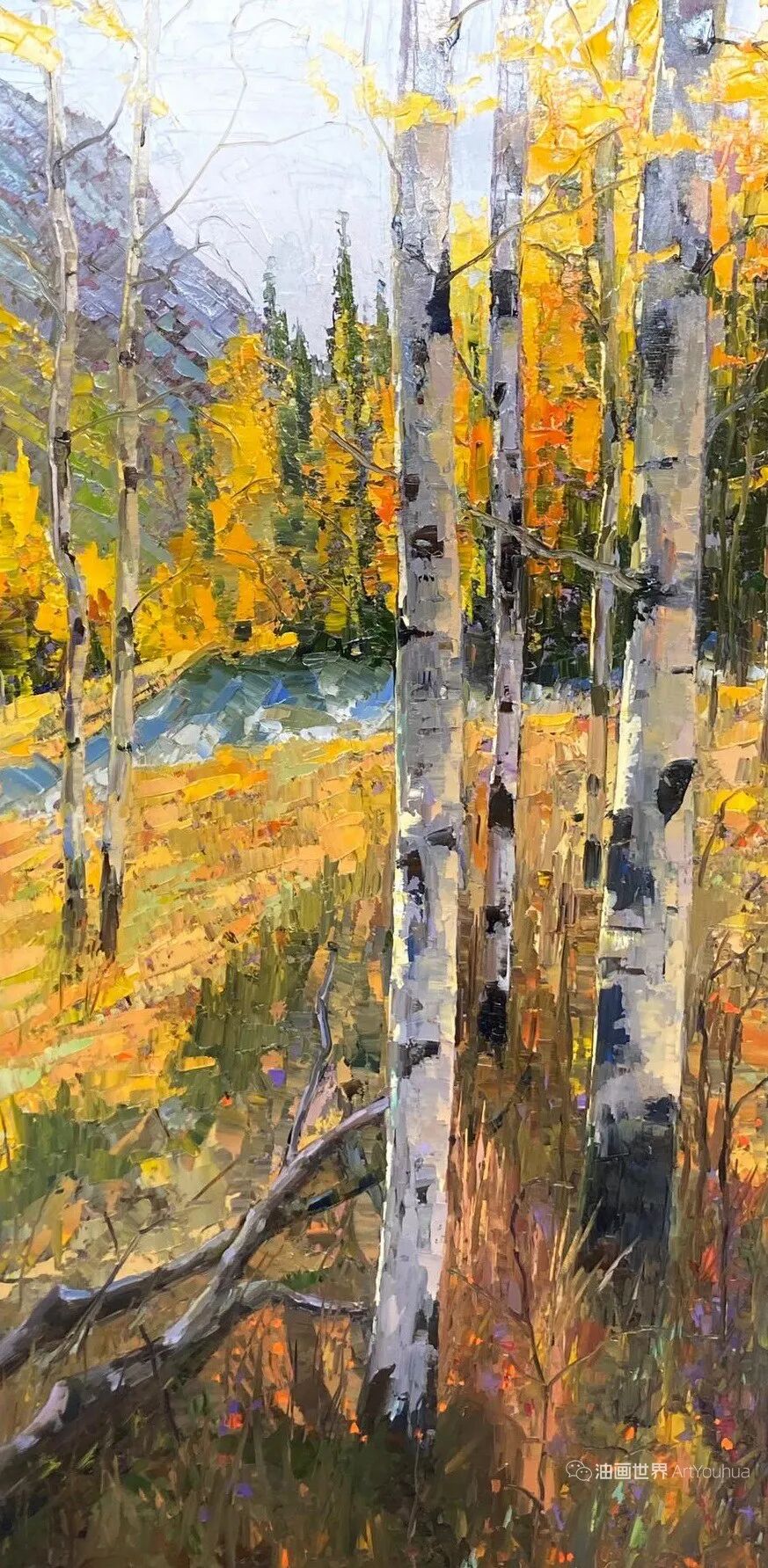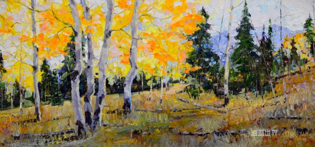 我很幸运地出生在蒙大拿州海伦娜市的大天空之乡。我在成长过程中获得了对户外活动的极大热爱。我记得我父亲把我背在背上穿过鳟鱼溪,以便我们能去下一个洞。钓鱼的最佳时间总是在秋天,那时溪流低而清澈,秋色总是很壮观。每次我画秋天的杨树时,脑海中都会浮现出许多特别的记忆。
