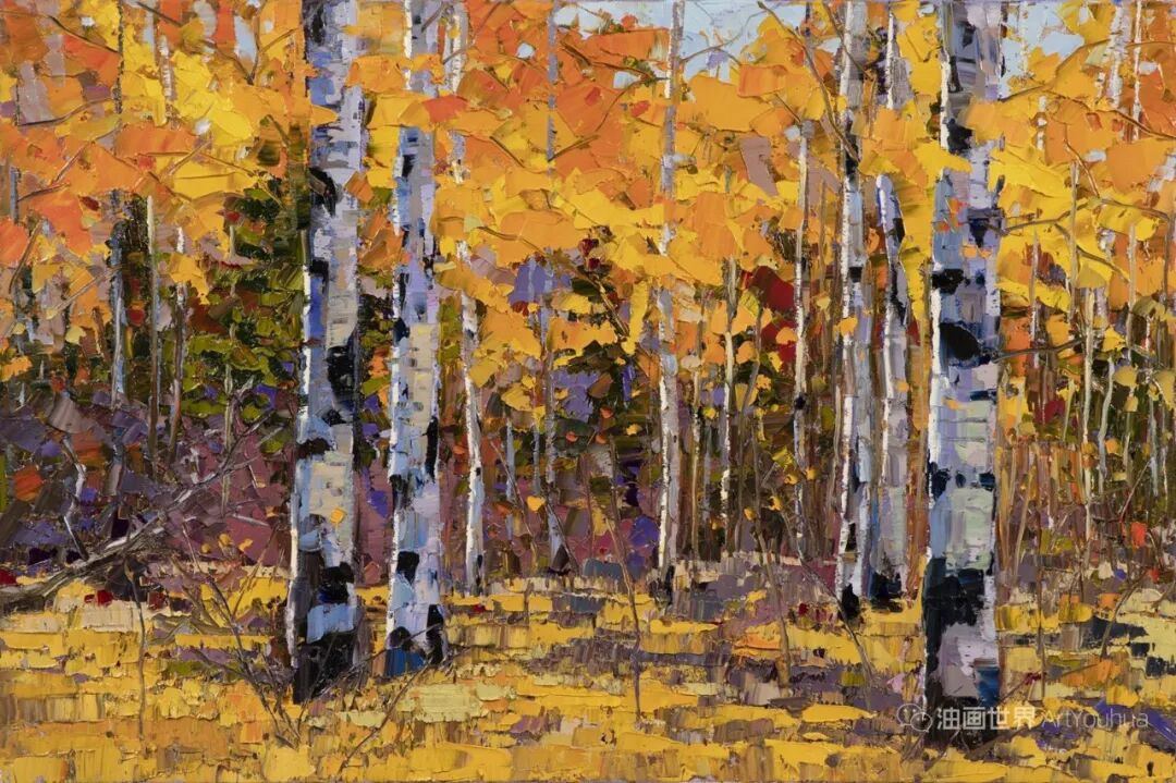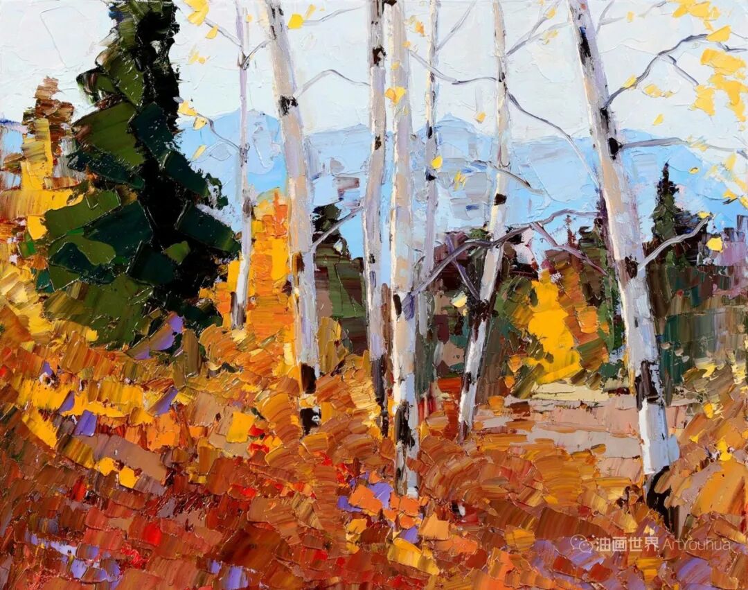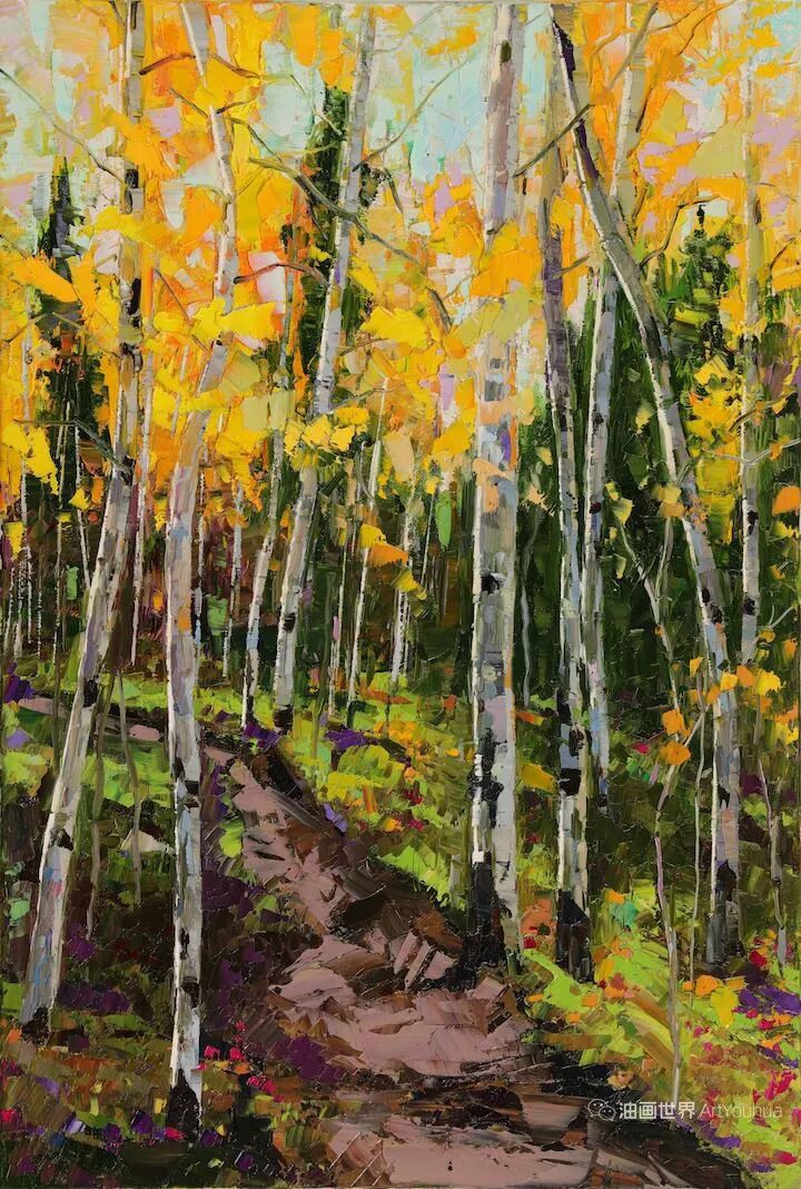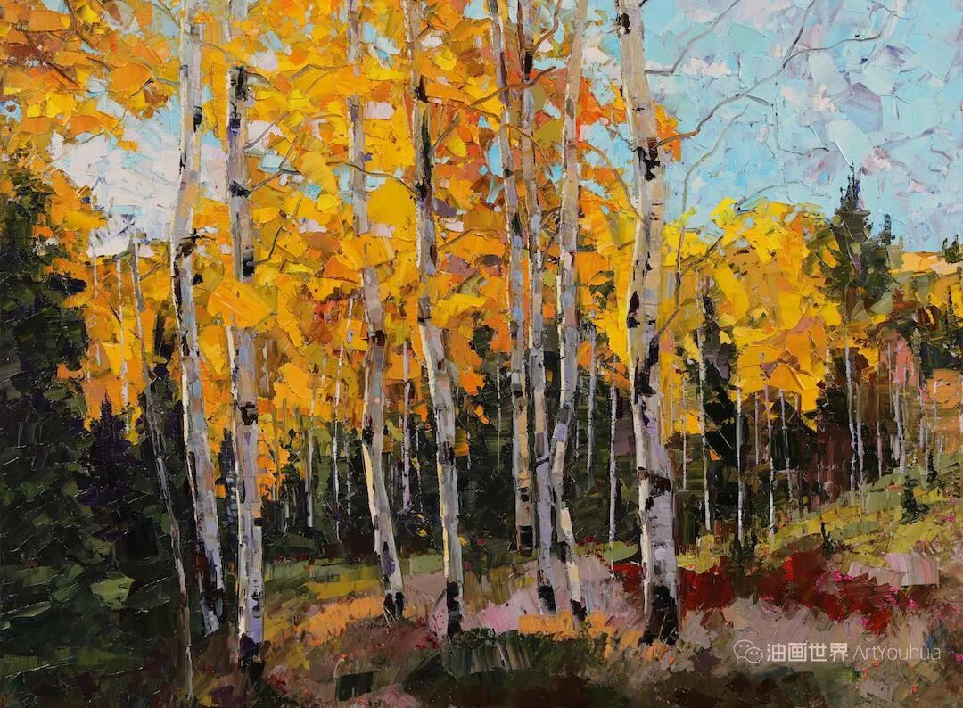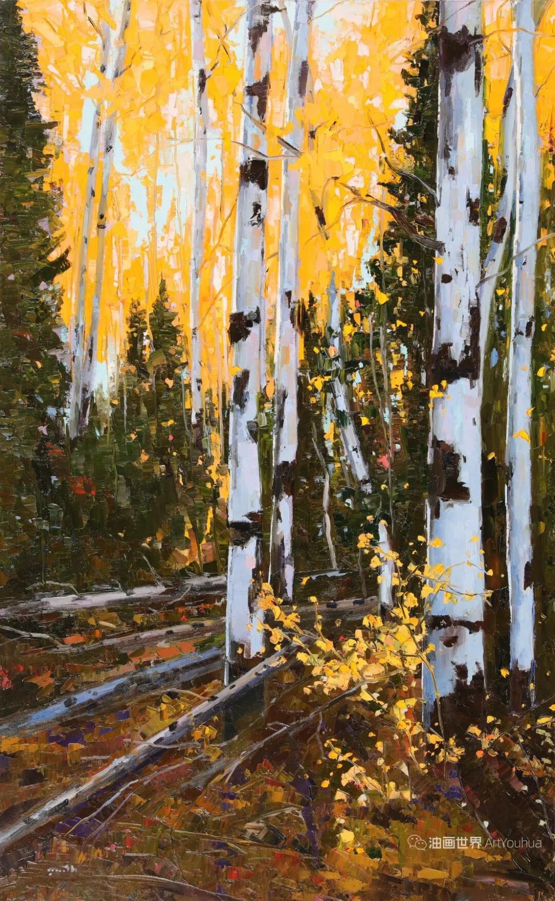 我很幸运地出生在蒙大拿州海伦娜市的大天空之乡。我在成长过程中获得了对户外活动的极大热爱。我记得我父亲把我背在背上穿过鳟鱼溪,以便我们能去下一个洞。钓鱼的最佳时间总是在秋天,那时溪流低而清澈,秋色总是很壮观。每次我画秋天的杨树时,脑海中都会浮现出许多特别的记忆。