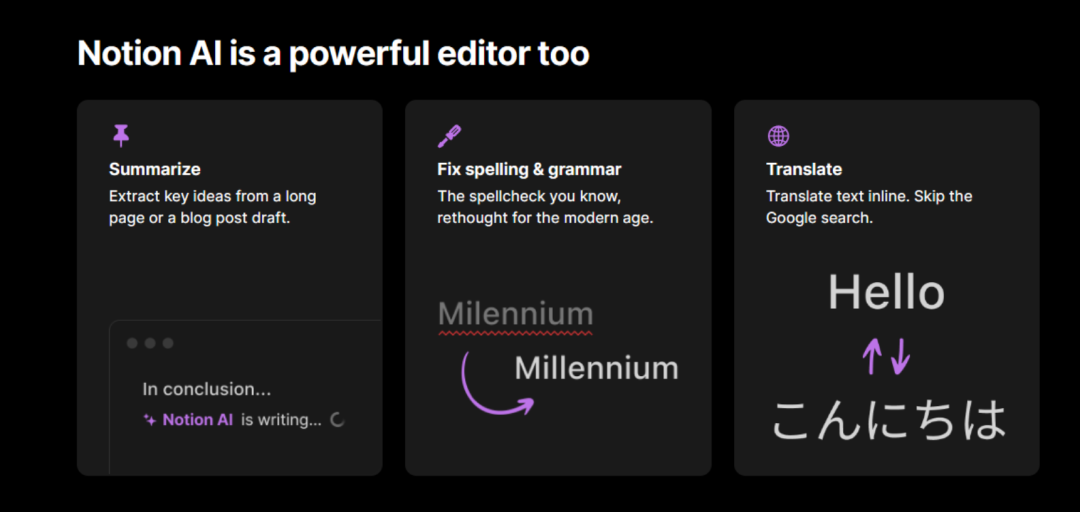 文字编辑: 无论是拼写、语法,还是翻译,Notion AI 都能发现错误,甚至翻译整篇文章。