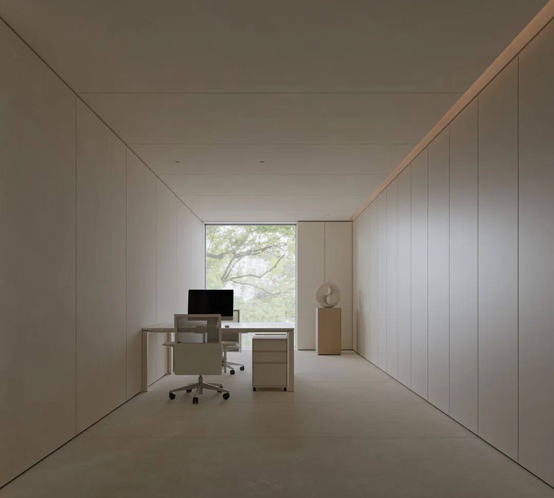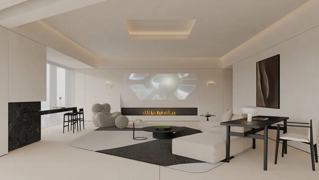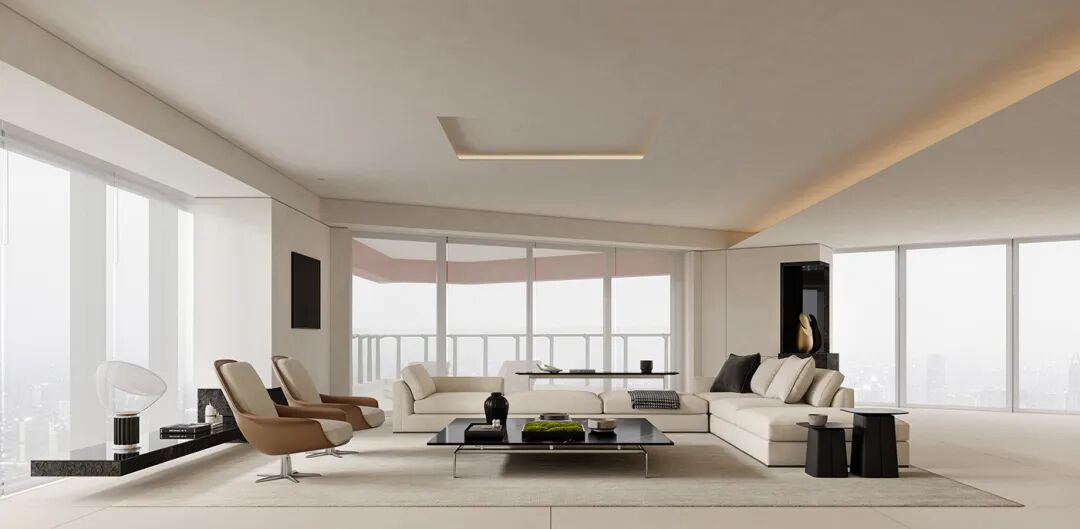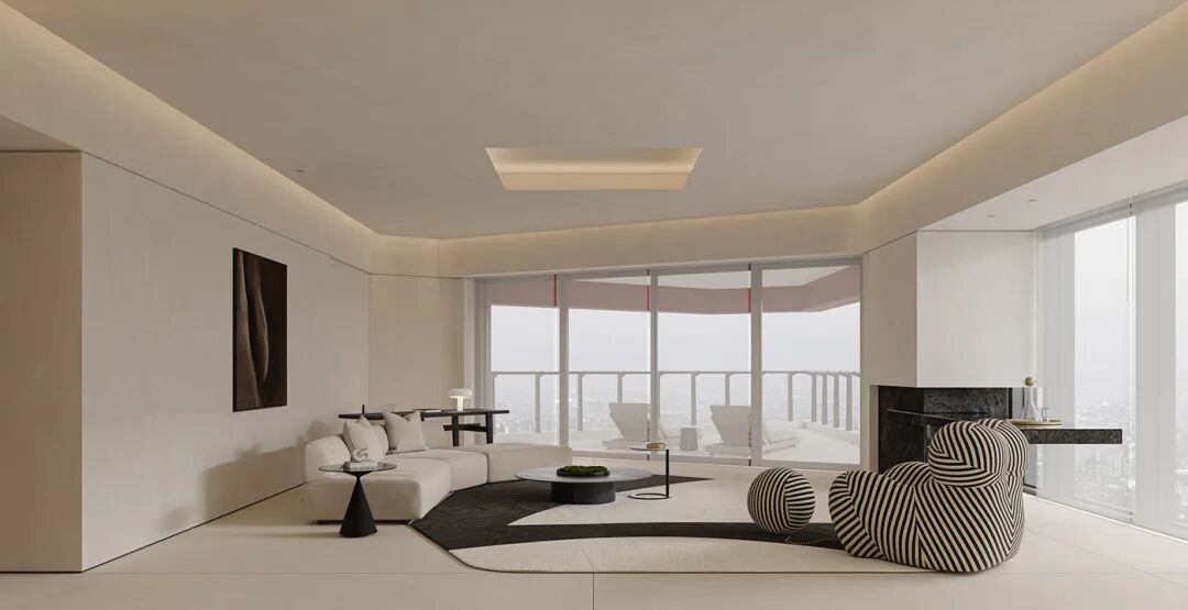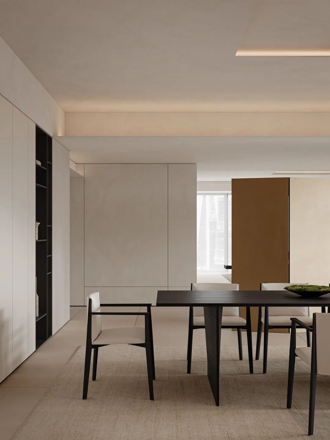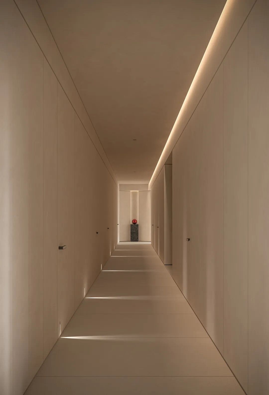 这是一个位于都市的大平层项目,采用极简的设计手法,简单克制的装饰搭配淡雅的暖白色,中和空间的冷峻气息。