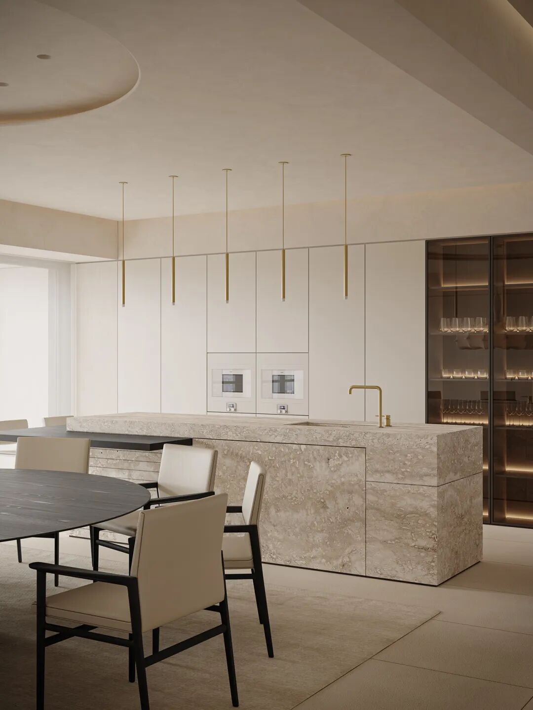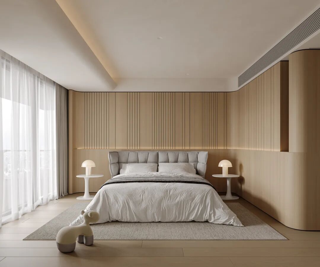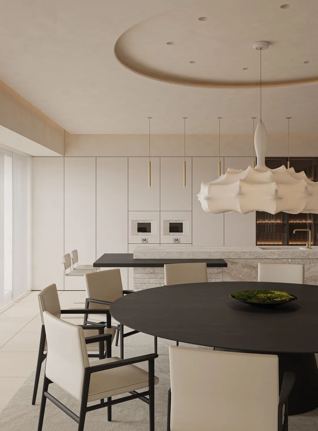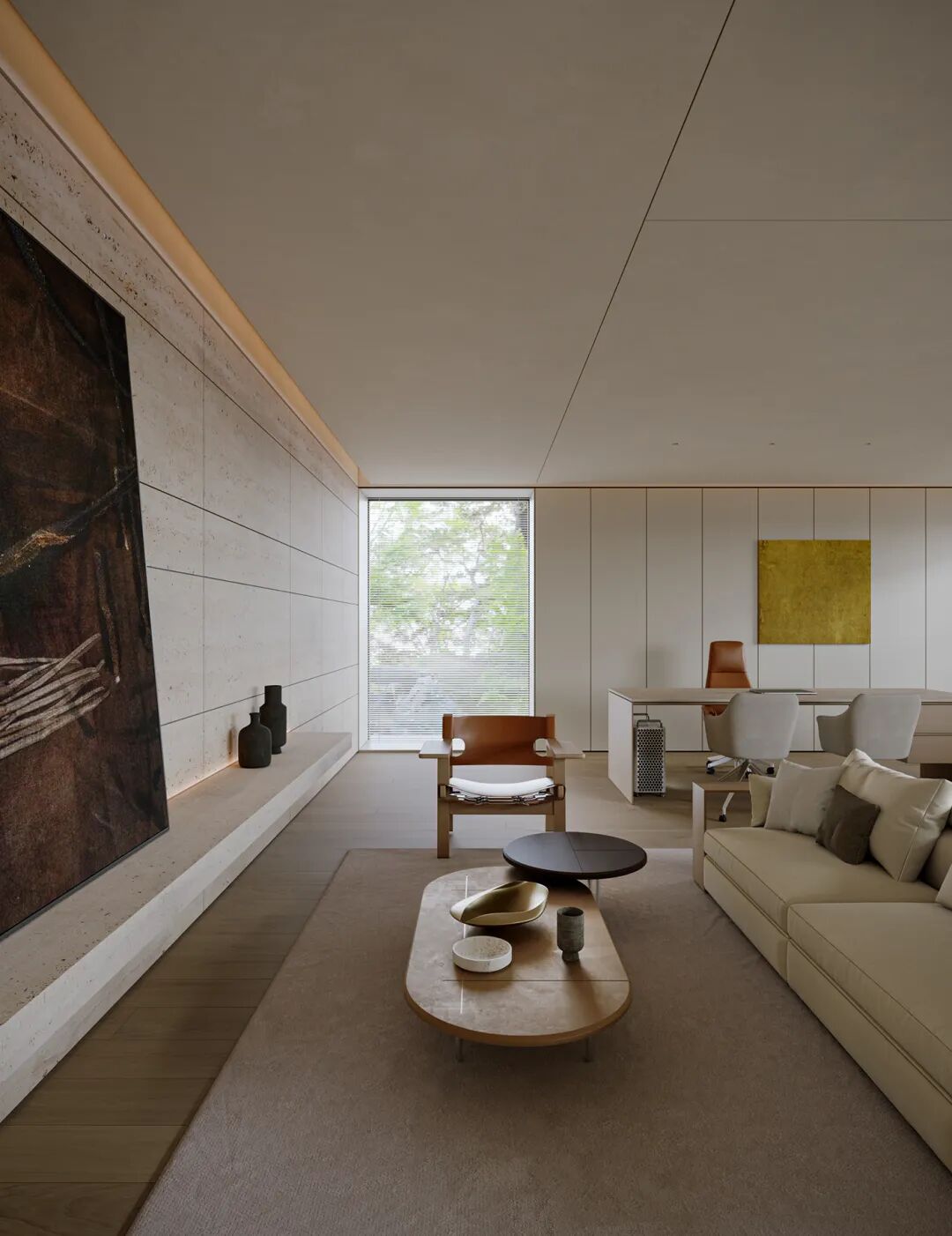 这是一个位于都市的大平层项目,采用极简的设计手法,简单克制的装饰搭配淡雅的暖白色,中和空间的冷峻气息。