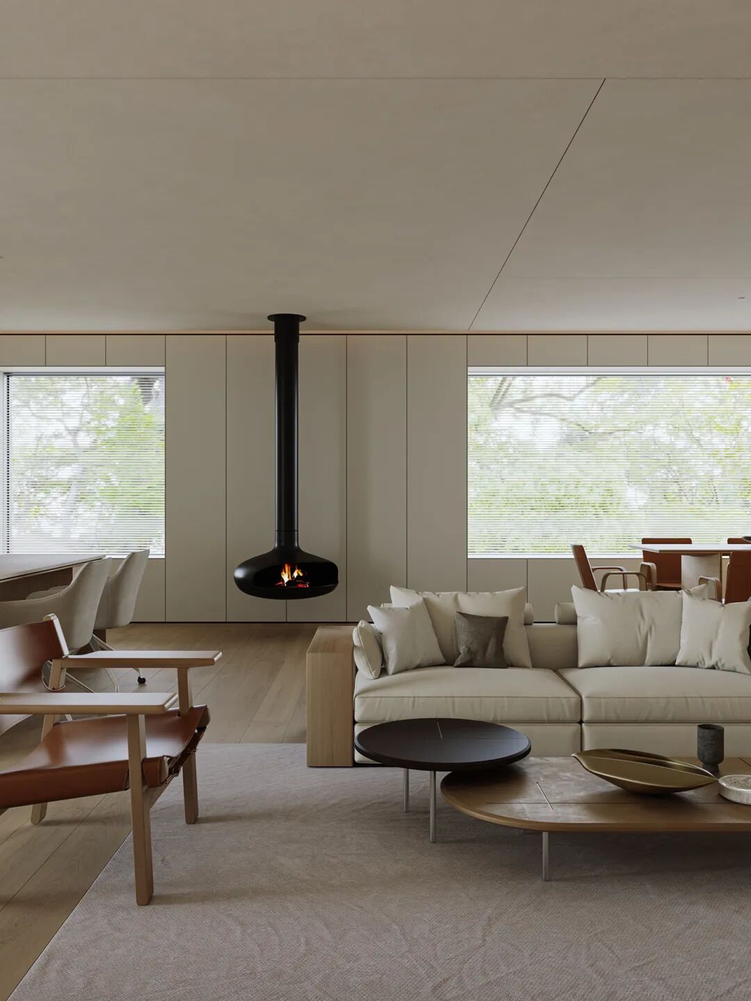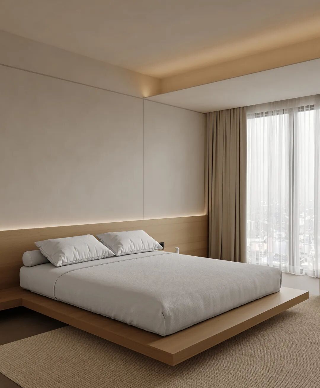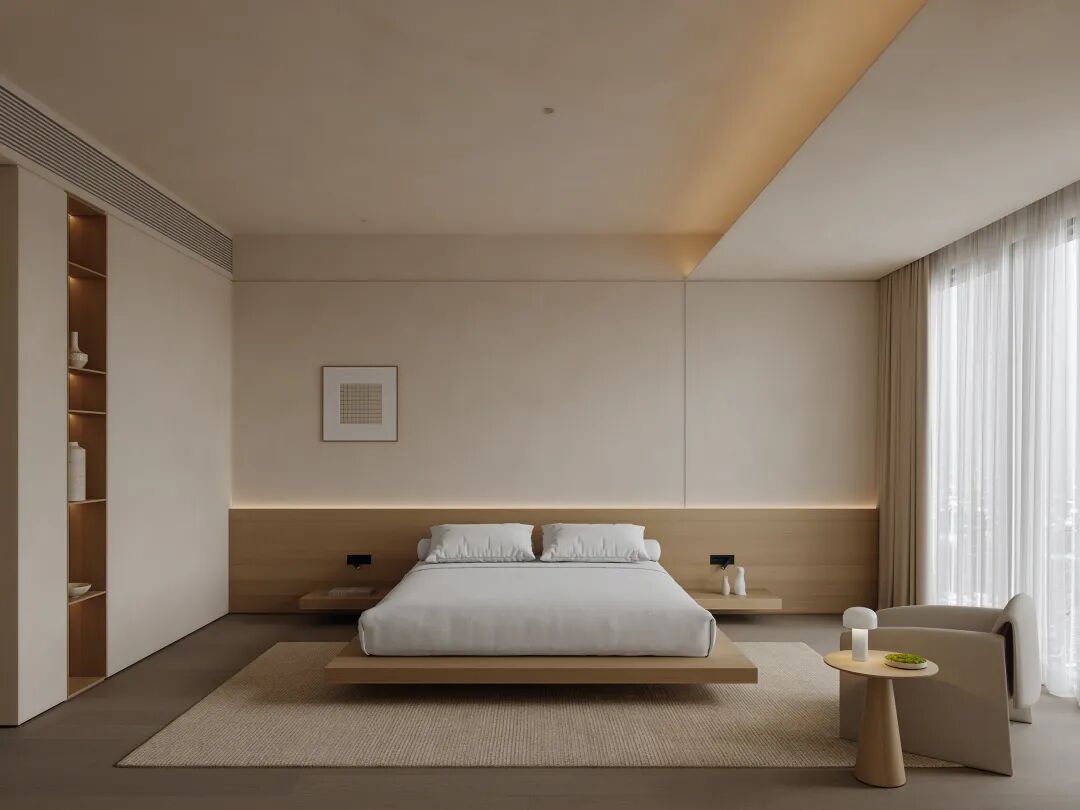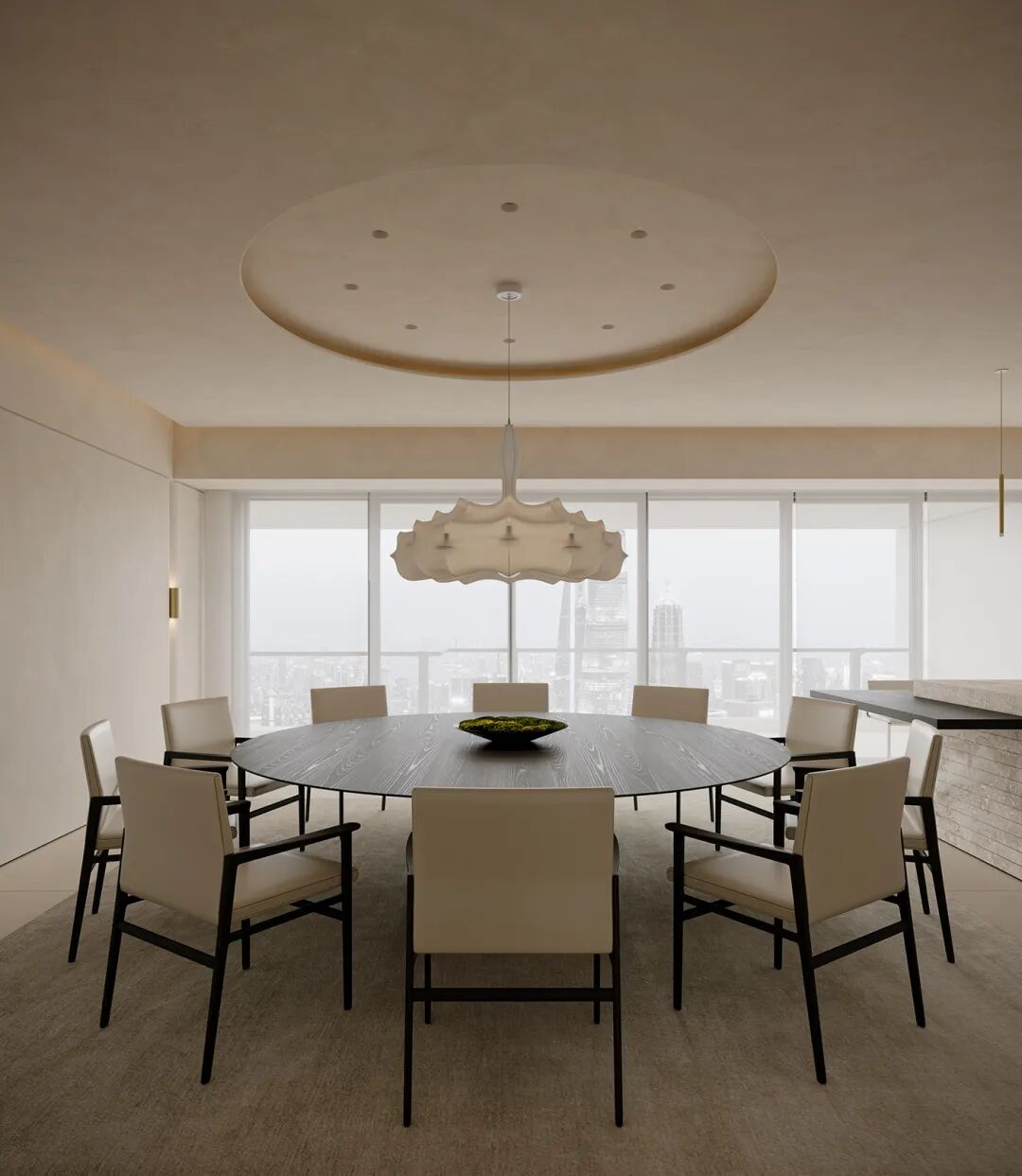 这是一个位于都市的大平层项目,采用极简的设计手法,简单克制的装饰搭配淡雅的暖白色,中和空间的冷峻气息。