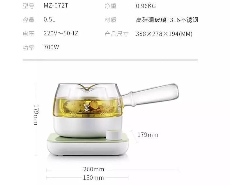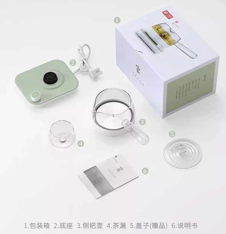 整体由煮茶壶和加热底座2个部分组成,人工吹制的玻璃壶,壶身摒弃了多余线条,使全壶呈平、净、圆滑观感。