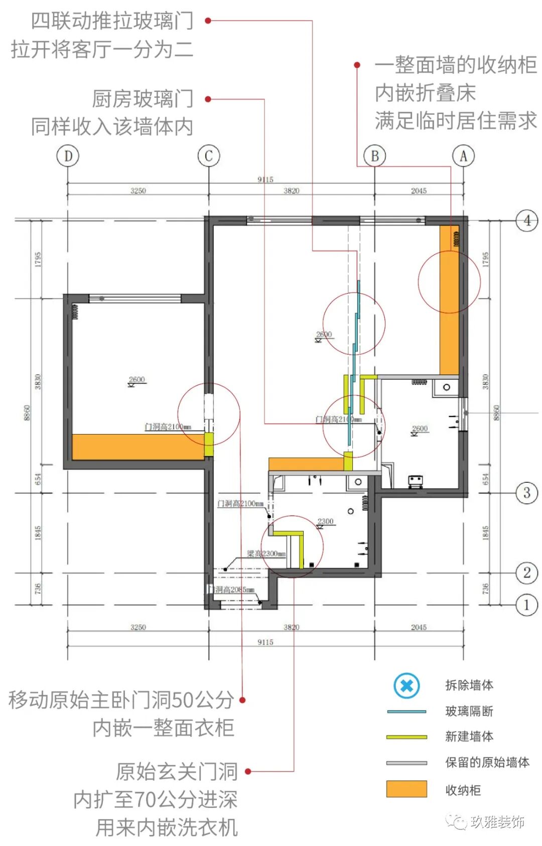 通过移动主卧入口,使其背后能容下整面墙的衣柜。衣柜长度由原来的2米变成了3米。