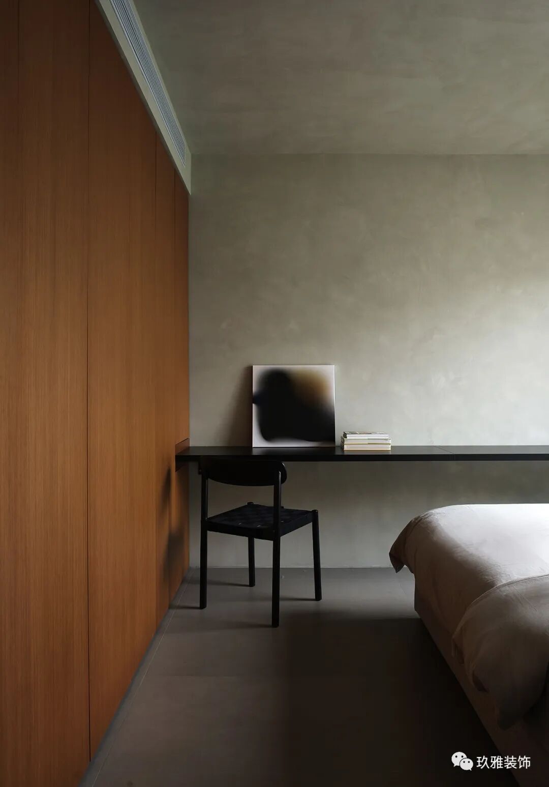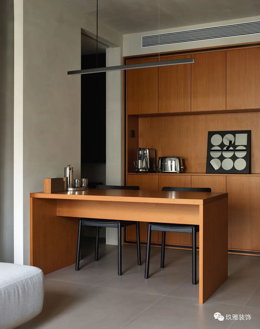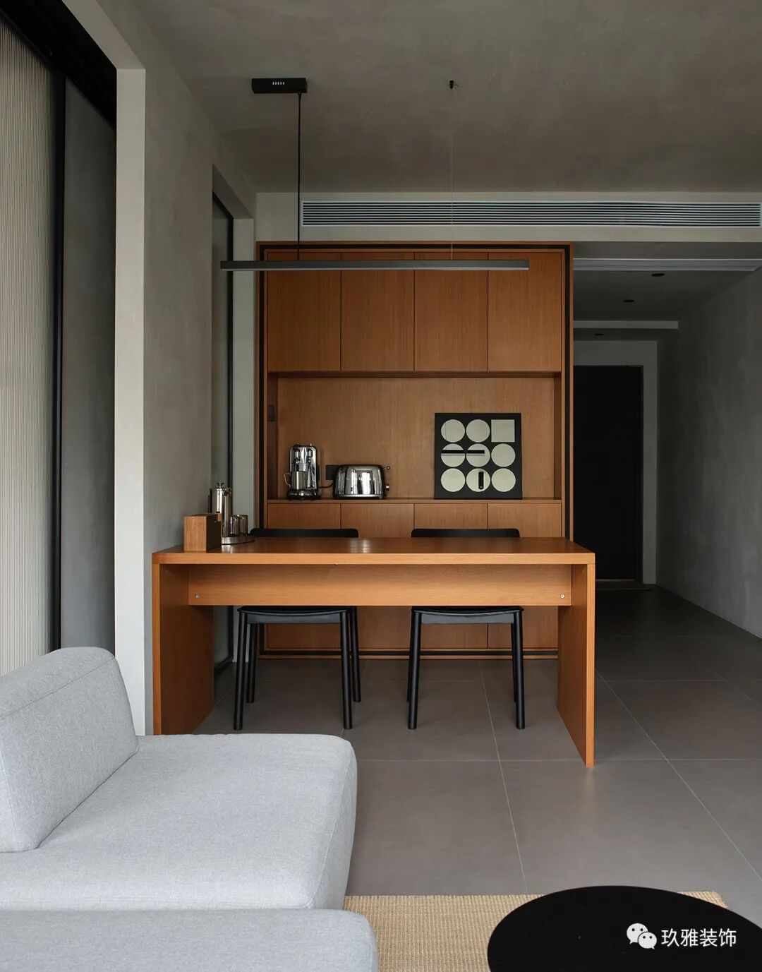 2、水泥艺术漆搭配柚木定制柜,粗野中点缀热情。