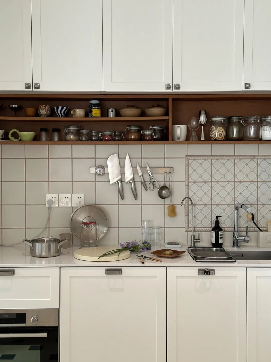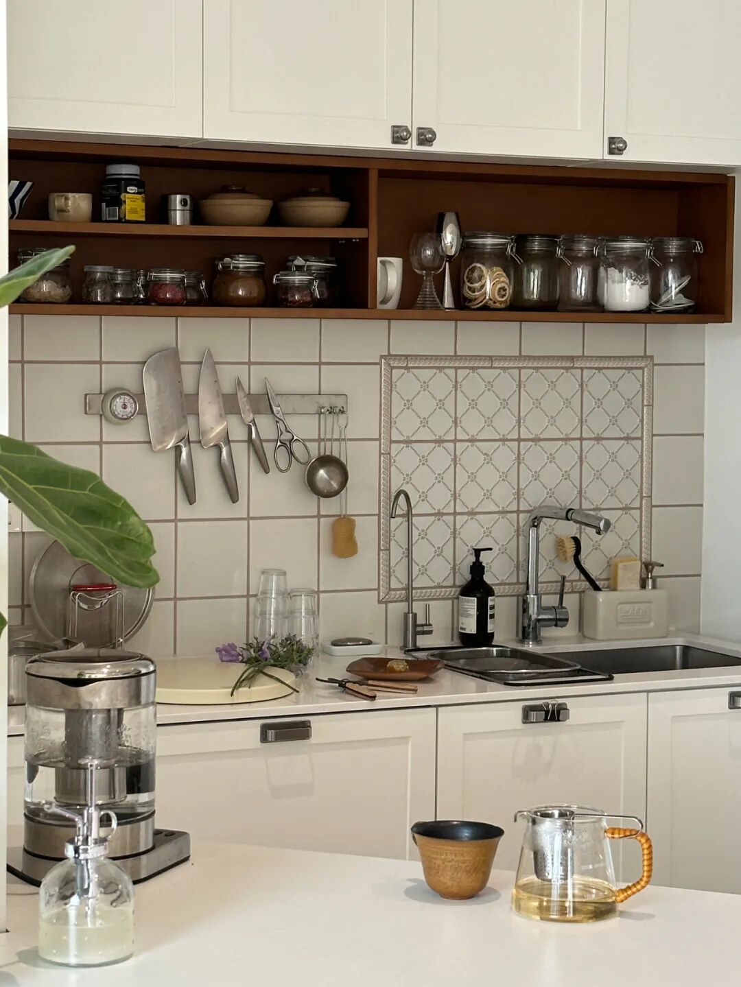 水槽前的墙面用了一款格纹的法式小花砖,虽然只是轻轻点缀,但一下就有了浪漫如诗的氛围。如果大家想做同款,一定要注意美缝的颜色,浅卡其色和小花砖就很配。